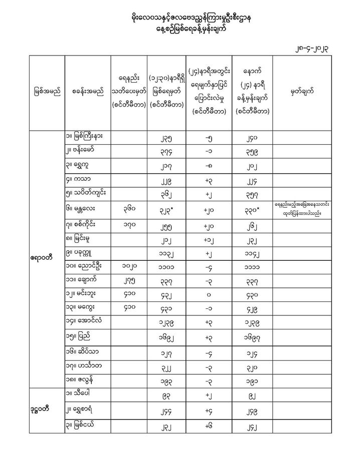 Apr 28,2023 |03:18 | ၂၈-၄-၂၀၂၃ မိုးလေဝသနှင့်ဇလဗေဒညွှန်ကြားမှုဦးစီးဌာနမှ (၂၈.၄.၂၀၂၃) ရက်နေ့တွင် ထုတ်ပြန်သည့် နေ့စဉ်မြစ်ရေခန့်မှန်းချက်များကို အောက်ပါအတိုင်း ဖော်ပြလိုက်ပါတယ်... Crd>>>မိုး/ဇလ