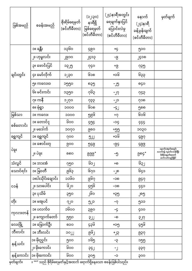 Oct 10,2023 |04:05 | ၁၀-၁၀-၂၀၂၃ မိုးလေဝသနှင့်ဇလဗေဒညွှန်ကြားမှုဦးစီးဌာနမှ (၁၀.၁၀.၂၀၂၃) ရက်နေ့တွင် ထုတ်ပြန်သည့် နေ့စဉ်မြစ်ရေခန့်မှန်းချက်များကို အောက်ပါအတိုင်း ဖော်ပြလိုက်ပါတယ်... မိုး/ဇလ