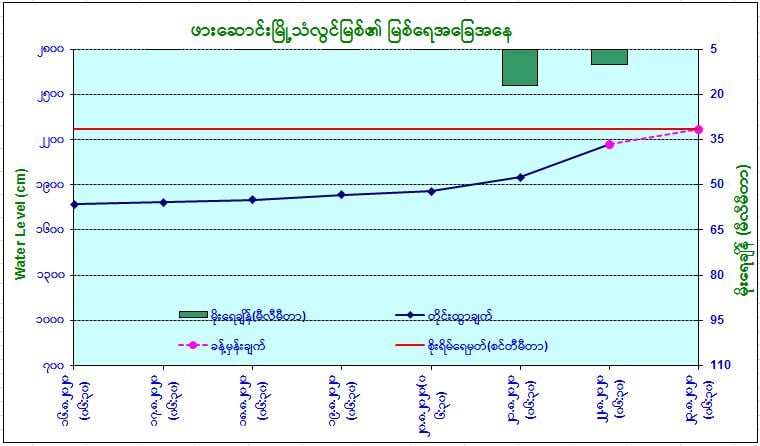 မိုးလေဝသနှင့် ဇလဗေဒညွှန်ကြားမှုဦးစီးဌာနမှ ၂၀၂၀ ပြည့်နှစ်၊ ဩဂုတ်လ (၂၂)ရက်နေ့ (၁၀:၀၀) နာရီအချိန်တွင် မြစ်ရေကြီးခြင်းသတိပေးချက်ကို အောက်ပါအတိုင်း ထုတ်ပြန်ထားသည်။