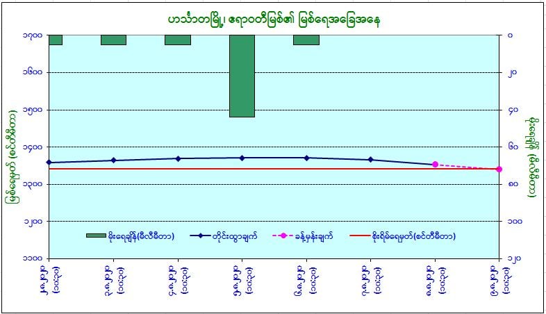 ယနေ့မြန်မာစံတော်ချိန် (၁၀:၃၀)နာရီအချိန် တိုင်းထွာချက်အရ ဧရာဝတီမြစ် ရေသည် ဟင်္သာတမြို့တွင် ပေဝက်ခန့် ယင်းမြို့၏ စိုးရိမ်ရေမှတ်အထက်သို့ ကျော်လွန်ရောက်ရှိနေပါသည်။ အဆိုပါမြစ်ရေ သည် နောက်(၁)ရက်အတွင်း ယင်းမြို့၏ စိုးရိမ်ရေမှတ်အောက် ပြန်လည်ကျဆင်းနိုင်ပါသည်။