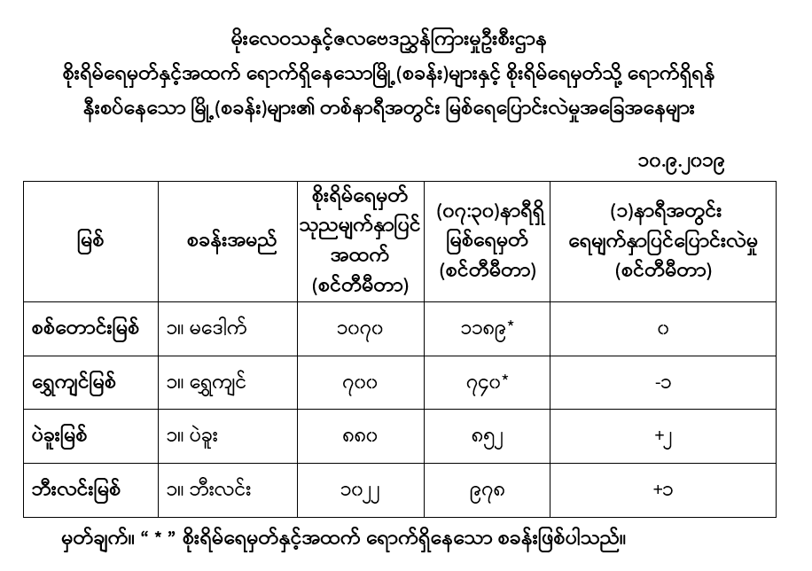 မိုးလေဝသနှင့် ဇလဗေဒညွှန်ကြားမှု ဦးစီးဌာနမှ ယနေ့နံနက် ၇ နာရီခွဲအချိန်တွင် တိုင်းတာရရှိခဲ့သော မြစ်ရေအခြေအနေမျာကို ထုတ်ပြန်ခဲ့ရာ မဒေါက်မြို့နှင့် ရွှေကျင်မြို့တို့တွင် မြစ်ရေသည် စိုးရိမ်ရေမှတ်အထက်သို့ ကျော်လွန်ရောက်ရှိနေကြောင်း သိရသည်။