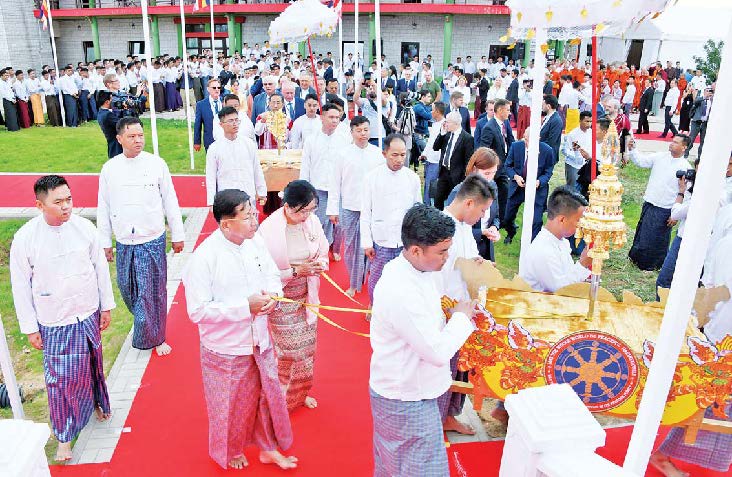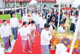 ၎င်းနောက် နိုင်ငံတော်စီမံအုပ်ချုပ်ရေးကောင်စီဥက္ကဋ္ဌ၊ နိုင်ငံတော်ဝန်ကြီးချုပ် နှင့်ဇနီးနှင့် အဖွဲ့ဝင်များသည် ဆရာတော်၊ သံဃာတော်များအား နေ့ဆွမ်းဆက်ကပ် လှူဒါန်းကြပြီး အခမ်းအနားတက်ရောက်လာကြသူများအား နေ့လယ်စာဖြင့် တည်ခင်းဧည့်ခံခဲ့သည်။ နေ့လည်စာသုံးဆောင်အပြီးတွင် နိုင်ငံတော်စီမံအုပ်ချုပ်ရေးကောင်စီဥက္ကဋ္ဌ နိုင်ငံတော်ဝန်ကြီးချုပ်နှင့် အခမ်းအနားတက်ရောက်လာကြသည့် ဧည့်သည်တော်ကြီးများသည် အမှတ်တရလက်ဆောင်ပစ္စည်းများ အပြန်အလှန်ပေးအပ်ခဲ့ကြသည်။