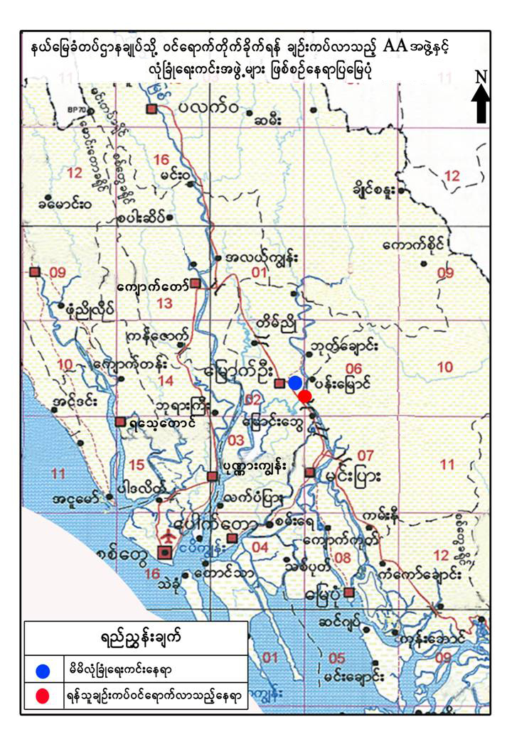 လုံခြုံရေးအဖွဲ့များသည် AA အဖွဲ့ ချဉ်းကပ်ရာ လမ်းကြောင်းတစ်လျှောက် မိုင်းရှင်းလင်းခြင်းလုပ်ငန်းများ ဆောင်ရွက်ခဲ့ရာ နံနက် ၆ နာရီ ၄၅ မိနစ်ခန့်တွင် AA အဖွဲ့မှ အလောင်းတစ်လောင်းအား လက်ပစ်ဗုံးတစ်လုံး၊ ပလတ်စတစ်ပိုက်ဖြင့် ပြုလုပ်ထားသော ဒေသန္တရလက်လုပ် မိုင်းတစ်လုံး၊ ခဲယမ်းဆက်စပ်ပစ္စည်းများနှင့်အတူ သိမ်းဆည်းရမိခဲ့ကြောင်း သိရသည်။