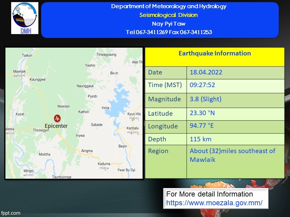 ၂၀၂၂ ခုနှစ်၊ ဧပြီလ (၁၈)ရက်နေ့၊ မြန်မာစံတော်ချိန် (၀၉)နာရီ၊ (၂၇)မိနစ်၊ (၅၂)စက္ကန့် အချိန်တွင် ကန့်ဘလူမြေငလျင်စခန်းမှ အနောက်-အနောက်မြောက်ဘက် (၄၈)မိုင်ခန့် ကွာဝေးသော မြန်မာနိုင်ငံပြည်တွင်း (မော်လိုက်မြို့၏ အရှေ့တောင်ဘက် (၃၂)မိုင်ခန့်အကွာ)၊ မြောက်လတ္တီတွဒ် (၂၃.၃၀) ဒီဂရီ၊ အရှေ့လောင်ဂျီတွဒ် (၉၄.၇၇)ဒီဂရီ၊ အနက် (၁၁၅) ကီလိုမီတာကို ဗဟိုပြု၍ အင်အား ရစ်(ခ်)တာစကေး (၃.၈)အဆင့်ရှိ အင်အားအနည်းငယ်ရှိသော မြေငလျင်တစ်ခု လှုပ်ရှားသွားကြောင်း တိုင်းထွာရရှိပါသည်။