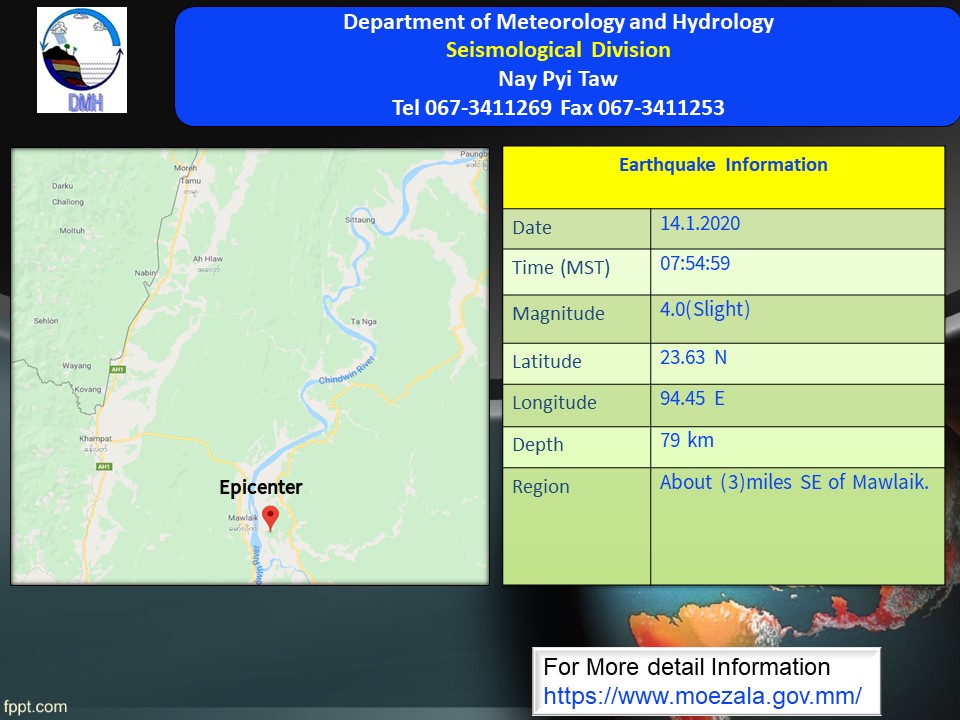 ၂၀၂၀ပြည့်နှစ်၊ ဇန်နဝါရီလ(၁၄)ရက်နေ့၊ မြန်မာစံတော်ချိန် (ဝ၇)နာရီ၊ (၅၄)မိနစ်၊ (၅၉) စက္ကန့် အချိန်တွင် တမူးမြေငလျင်စခန်းမှ တောင်-အရှေ့တောင်ဘက် (၄၁)မိုင် ခန့်ကွာဝေးသော မြန်မာနိုင်ငံပြည်တွင်း (မော်လိုက်မြို့၏ အရှေ့တောင်ဘက် (၃)မိုင်ခန့် အကွာ)၊ မြောက်လတ္တီတွဒ် (၂၃.၆၃)ဒီဂရီ၊ အရှေ့လောင်ဂျီတွဒ် (၉၄.၄၅)ဒီဂရီ၊ အနက်(၇၉)ကီလိုမီတာခန့်ကို ဗဟိုပြု၍ အင်အားရစ်(ခ်)တာစကေး(၄.ဝ)အဆင့်ရှိ အင်အားအနည်းငယ်ရှိသော မြေငလျင်တစ်ခု လှုပ်ရှားသွား ကြောင်း မိုးလေဝသနှင့် ဇလဗေဒညွှန်ကြားမှုဦးစီးဌာနမှ သိရသည်။