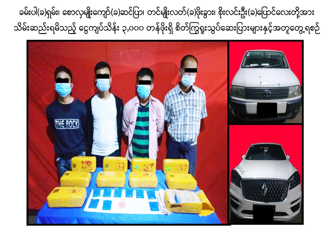 မူးယစ်ဆေးဝါး တားဆီးနှိမ်နင်းရေး ရဲတပ်ဖွဲ့မှ တပ်ဖွဲ့ဝင်များပါဝင်သော ပူးပေါင်းအဖွဲ့ သည် ဒီဇင်ဘာ ၃၁ ရက် ညနေ ၃ နာရီတွင် မော်လမြိုင်မြို့၊ မြို့ရှောင်လမ်းတွင် Probox အမျိုးအစား မော်တော်ယာဉ်ပေါ်မှ BORGWARD အမျိုးအစားမော်တော်ယာဉ်ပေါ်သို့ မူးယစ်ဆေးဝါးများ တင်ဆောင်နေကြောင်း သတင်းအရ သွားရောက်စစ်ဆေးရှာဖွေရာ စိုးလင်းဦး၊ တင်မျိုးလတ်၊ စောလှမျိုးကျော်နှင့် ခမ်းပါတို့(၄)ဦးအား တွေ့ရှိရပြီး စိုးလင်းဦး မောင်းနှင်သော Probox မော်တော်ယာဉ်ပေါ်မှ ငွေကျပ်သိန်း ၃,၀၀၀ တန်ဖိုးရှိ စိတ်ကြွရူးသွပ်ဆေးပြား ၁၀၀,၀၀၀ ကို လည်းကောင်း။