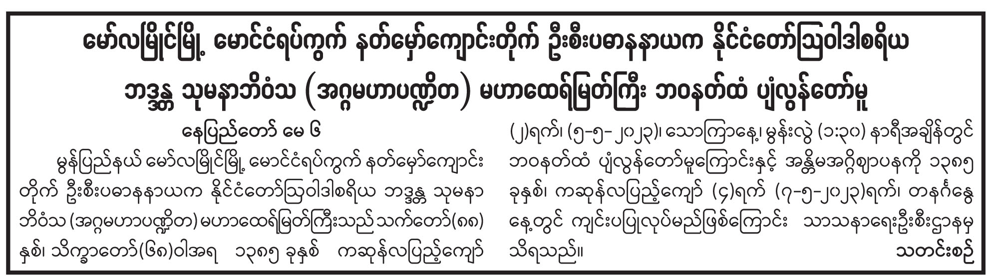 မော်လမြိုင်မြို့ မောင်ငံရပ်ကွက် နတ်မှော်ကျောင်းတိုက် ဦးစီးပဓာန နာယက နိုင်ငံတော်ဩဝါဒါစရိယ ဘဒ္ဒန္တ သုမနာဘိဝံသ (အဂ္ဂမဟာပဏ္ဍိတ) မဟာထေရ်မြတ်ကြီး ဘဝနတ်ထံ ပျံလွန်တော်မူ