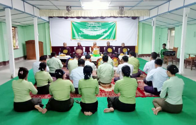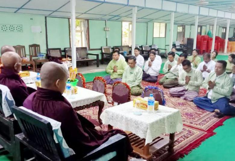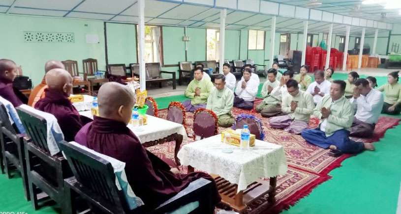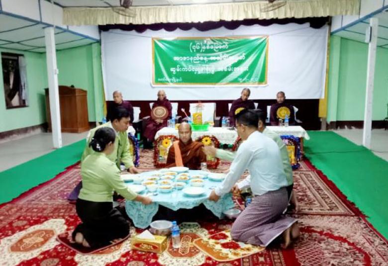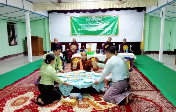 ဦးစွာ ဆရာတော် သံဃာတော်များ၊ မြို့နယ်စီမံအုပ်ချုပ်ရေးအဖွဲ့ ဥက္ကဋ္ဌ ဦးကံထွန်းအောင်နှင့် အဖွဲ့ဝင်များ၊ အထွေထွေ အုပ်ချုပ်ရေးဦးစီးဌာနမှ ဝန်ထမ်းများ၊ ဧည့်ပရိတ်သတ်များက နမောတဿ သုံးကြိမ်ရွတ်ဆို ဘုရားကန်တော့ပြီး ဆရာတော်များထံမှ ငါးပါးသီလ ခံယူဆောက်တည်ကြသည်။ ဆက်လက်၍ ဆရာတော် သံဃာတော်များက ပရိတ်တရားတော် မျာ ရွတ်ပွား ချီးမြှင့်တော် မူကြပြီး မြို့နယ်စီမံအုပ်ချုပ်ရေးအဖွဲ့ဥက္ကဋ္ဌနှင့် အဖွဲ့ဝင်များက ဆရာတော် သံဃာတော်များအား ဝါဆိုသင်္ကန်း၊ နဝကမ္မအလှူငွေများ ဆက်ကပ်လှူဒါန်းကြသည်။ ထို့နောက် ဆရာတော်ထံမှ အနုမောဒနာတရား နာယူကာ လှူဒါန်းမှုအစုစုအတွက် ရေစက်သွန်းချ အမျှပေးဝေကြသည်။