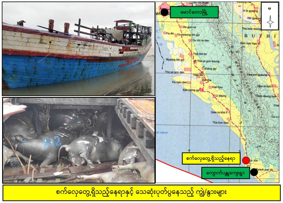 မောင်တောမြို့နယ်၊ ကျောက်ပန္တုကျေးရွာအနောက်ဘက် ပင်လယ်ကမ်းစပ်တွင် စက်တင်ဘာ ၄ ရက် နံနက် ၈ နာရီက ပိုင်ရှင်မဲ့လှေ(၁)စီး တွေ့ရှိကြောင်း သတင်းအရ ရဲတပ်ဖွဲ့ဝင်များက သွားရောက်စစ်ဆေးရာ အလျားပေ(၆၀)၊ အနံ(၁၈)ပေ၊ အမြင့်ပေ(၂၀)၊ ရေစူး(၁၂)ပေခန့်ရှိ မြင်းကောင်ရေ (၁၈၀) အင်ဂျင်တပ်ဆင်ထားသော ဝါးလက်လှေတစ်စီးအား ပိုင်ရှင်မဲ့တွေ့ရှိရကြောင်း၊ အဆိုပါလှေမှာ ဝဲဘက်နှင့်ယာဘက် ပျဉ်ကာများကွဲအက်၍ ခါးကျိုးကာ ရေများစိမ့်ဝင်နေကြောင်းနှင့် လှေပေါ်၌ သေဆုံးပုပ်ပွနေသည့် ကျွဲ၊ နွားအကောင် (၅၀)ခန့်အား တွေ့ရှိရ၍ စုံစမ်းစစ်ဆေးလျက်ရှိကြောင်း မြန်မာနိုင်ငံရဲတပ်ဖွဲ့မှ သတင်းရရှိသည်။