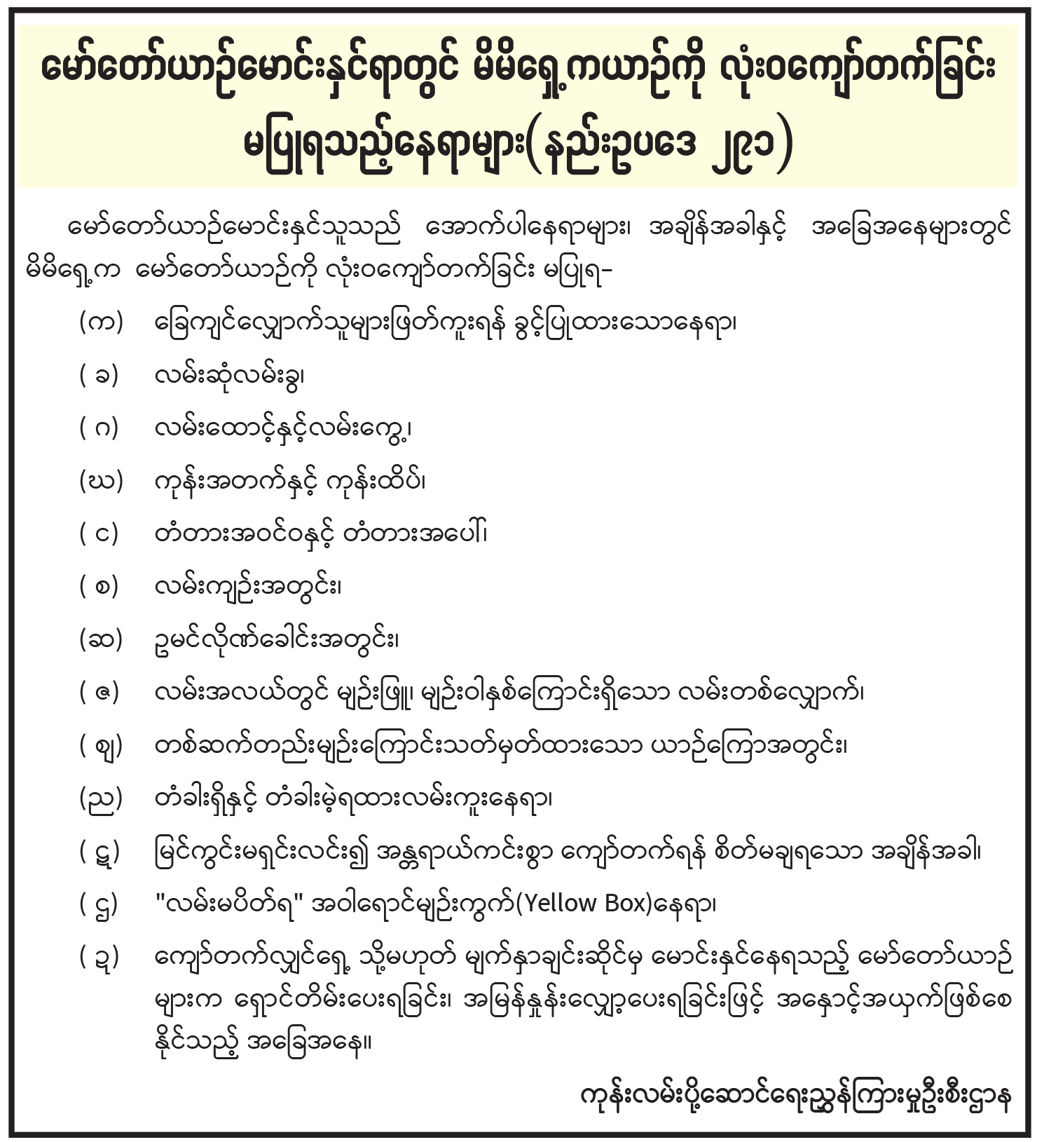 မော်တော်ယာဉ်မောင်းနှင်ရာတွင် မိမိရှေ့ကယာဉ်ကို လုံးဝကျော်တက်ခြင်း မပြုရသည့်နေရာများ (နည်းဥပဒေ ၂၉၁)