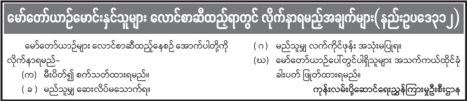 မော်တော်ယာဉ်မောင်းနှင်သူများ လောင်စာဆီထည့်ရာတွင် လိုက်နာရမည့်အချက်များ(နည်းဥပဒေ၃၁၂)