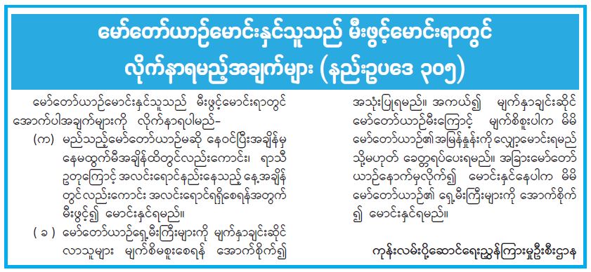(က)    မည်သည့်မော်တော်ယာဉ်မဆို  နေဝင်ပြီးအချိန်မှ နေမထွက်မီအချိန်ထိတွင်လည်းကောင်း၊    ရာသီ ဥတုကြောင့် အလင်းရောင်နည်းနေသည့် နေ့အချိန် တွင် လည်းကောင်း  အလင်းရောင်ရရှိစေရန်အတွက် မီးဖွင့်၍  မောင်းနှင်ရမည်။