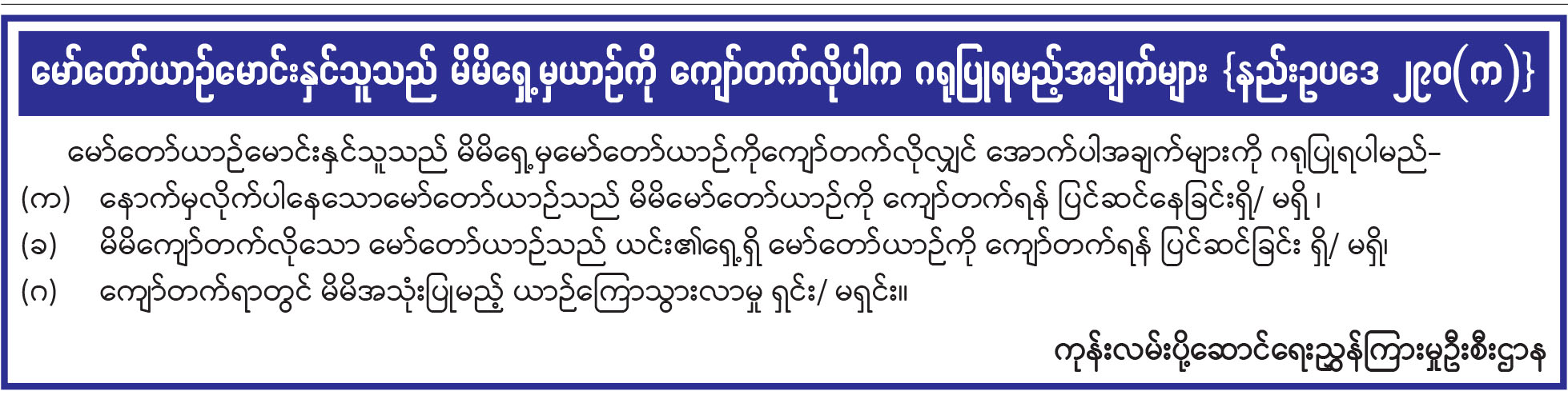 မော်တော်ယာဉ်မောင်းနှင်သူသည် မိမိရှေ့မှယာဉ်ကို ကျော်တက်လိုပါက ဂရုပြုရမည့်အချက်များ (နည်းဥပဒေ ၂၉၀(က))