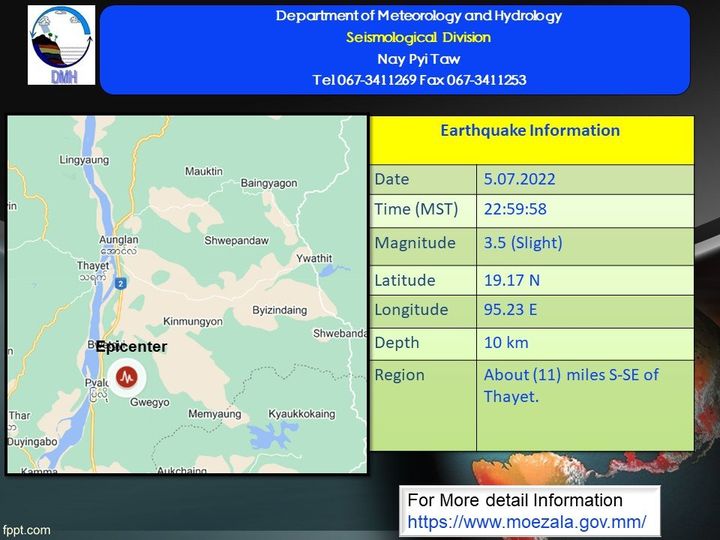 ၂၀၂၂ ခုနှစ်၊ ဇူလိုင်လ (၅) ရက်နေ့၊ မြန်မာစံတော်ချိန် (၂၂)နာရီ၊ (၅၉)မိနစ်၊ (၅၈)စက္ကန့် အချိန် တွင် နေပြည်တော်မြေငလျင်စခန်းမှ အနောက်တောင်ဘက် (၇၂) မိုင်ခန့်အကွာ၊ မြန်မာနိုင်ငံ ပြည်တွင်း (သရက်မြို့၏ တောင်-အရှေ့တောင်ဘက် မိုင်(၁၁) ခန့်အကွာ)၊ မြောက်လတ္တီတွဒ် (၁၉.၁၇) ဒီဂရီ၊ အရှေ့လောင်ဂျီတွဒ် (၉၅.၂၃)ဒီဂရီ၊ အနက် (၁၀)ကီလိုမီတာကို ဗဟိုပြု၍ အင်အားရစ်(ခ်)တာစကေး (၃.၅) အဆင့်ရှိ အင်အားအနည်းငယ်ရှိသော မြေငလျင်တစ်ခု လှုပ်ရှားသွားကြောင်း တိုင်းထွာရရှိပါသည်။