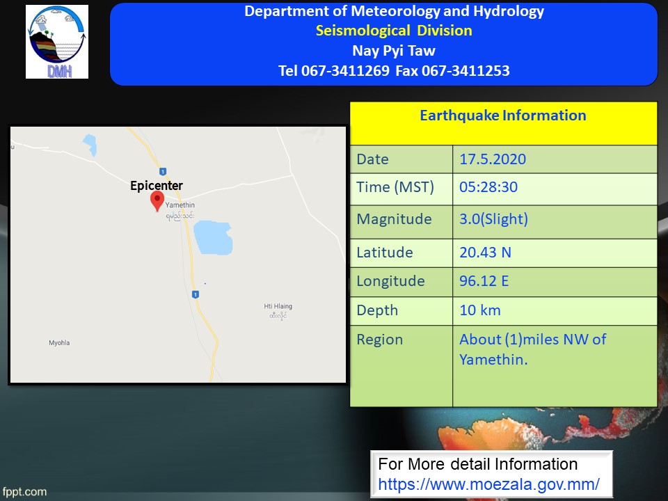 ၂၀၂၀ ပြည့်နှစ်၊ မေလ (၁၇) ရက်နေ့၊ မြန်မာစံတော်ချိန် (၀၅)နာရီ၊ (၂၈)မိနစ်၊ (၃၀)စက္ကန့် အချိန် တွင် နေပြည်တော်မြေငလျင်စခန်းမှ မြောက်ဘက် (၄၅)မိုင် ခန့်ကွာဝေးသော၊ မြန်မာနိုင်ငံပြည်တွင်း (ရမည်းသင်းမြို့၏ အနောက်မြောက်ဘက် (၁)မိုင် ခန့်အကွာ)၊ မြောက်လတ္တီတွဒ် (၂၀.၄၃) ဒီဂရီ၊ အရှေ့လောင်ဂျီတွဒ် (၉၆.၁၂) ဒီဂရီ၊ အနက် (၁၀) ကီလိုမီတာကို ဗဟိုပြု၍ အင်အားရစ်(ခ်)တာစကေး (၃.၀)အဆင့်ရှိ အင်အားအနည်းငယ်ရှိသော မြေငလျင်တစ်ခု လှုပ်ရှားသွားကြောင်း တိုင်းထွာရရှိပါသည်။