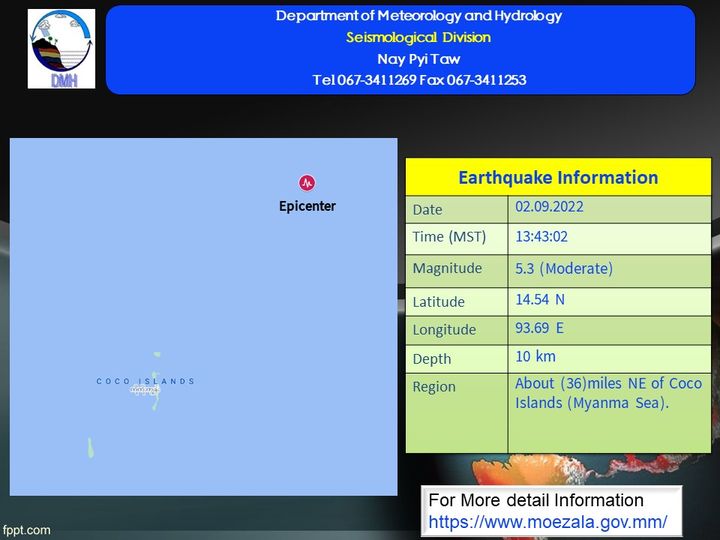 ၂၀၂၂ ခုနှစ်၊ စက်တင်ဘာလ (၂)ရက်နေ့၊ မြန်မာစံတော်ချိန် (၁၃)နာရီ၊ (၄၃)မိနစ်၊ (၀၂) စက္ကန့်အချိန်တွင် ကမ္ဘာအေးမြေငလျင်စခန်းမှ အနောက်တောင်ဘက် (၂၃၀)မိုင် ခန့်ကွာဝေးသော မြန်မာ့ပင်လယ်ပြင် (ကိုကိုးကျွန်း၏ အရှေ့မြောက်ဘက် (၃၆) မိုင်ခန့်အကွာ)၊ မြောက်လတ္တီတွဒ် (၁၄.၅၄)ဒီဂရီ၊ အရှေ့လောင်ဂျီတွဒ် (၉၃.၆၉)ဒီဂရီ၊ အနက် (၁၀)ကီလိုမီတာကို ဗဟိုပြု၍ အင်အားရစ်(ခ်)တာစကေး (၅.၃) အဆင့်ရှိ အင်အားအသင့်အတင့်ရှိသော မြေငလျင်တစ်ခု လှုပ်ရှားသွားကြောင်း တိုင်းထွာရရှိပါသည်။