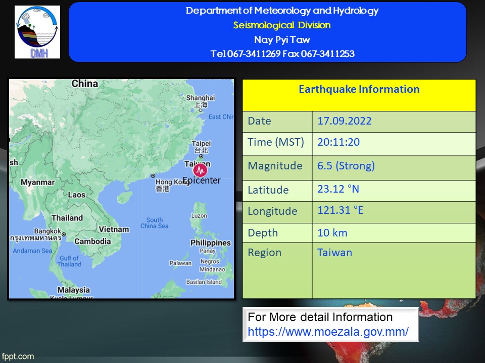 ၂၀၂၂ ခုနှစ်၊ စက်တင်ဘာလ (၁၇)ရက်နေ့၊ မြန်မာစံတော်ချိန် (၂၀)နာရီ၊ (၁၁)မိနစ်၊ (၂၀)စက္ကန့် အချိန်တွင် ကျိုင်းတုံမြေငလျင်စခန်းမှ အရှေ့ဘက် (၁၃၉၆)မိုင်ခန့်ကွာဝေးသော မြန်မာနိုင်ငံ ပြည်ပ (Taiwan)၊ မြောက်လတ္တီတွဒ် (၂၃.၁၂)ဒီဂရီ၊ အရှေ့လောင်ဂျီတွဒ် (၁၂၁.၃၁) ဒီဂရီ၊ အနက် (၁၀)ကီလိုမီတာခန့်ကို ဗဟိုပြု၍ အင်အား ရစ်(ခ်)တာစကေး (၆.၅)အဆင့်ရှိ အင်အားပြင်းထန်သော မြေငလျင်တစ်ခု လှုပ်ရှားသွားကြောင်း တိုင်းထွာရရှိပါသည်။