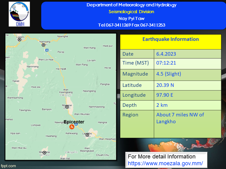 ၂၀၂၃ ခုနှစ်၊ ဧပြီလ (၆)ရက်နေ့၊ မြန်မာစံတော်ချိန် (၀၇)နာရီ၊ (၁၂)မိနစ်၊ (၂၁)စက္ကန့် အချိန်တွင် နမ့်စန်မြေငလျင်စခန်းမှ တောင်-အရှေ့တောင်ဘက် (၃၅)မိုင် ခန့်ကွာဝေးသော မြန်မာနိုင်ငံပြည်တွင်း (လင်းခေးမြို့၏ အနောက်မြောက် (၇) မိုင်ခန့်အကွာ)၊ မြောက်လတ္တီတွဒ် (၂၀.၃၉) ဒီဂရီ၊ အရှေ့လောင် ဂျီတွဒ် ((၉၇.၉၀)ဒီဂရီ၊ အနက်(၂)ကီလိုမီတာကို ဗဟိုပြု၍ အင်အားရစ်(ခ်)တာစကေး (၄.၅) အဆင့်ရှိ အင်အားအနည်းငယ်ရှိသော မြေငလျင်တစ်ခု လှုပ်ရှားသွားကြောင်း တိုင်းထွာရရှိပါသည်။
