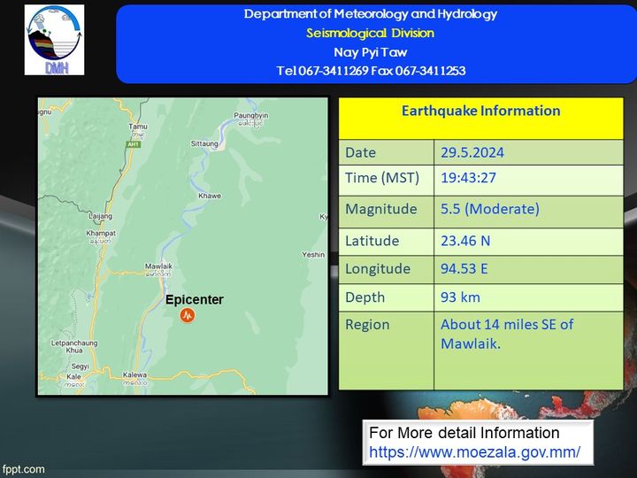 ၂၀၂၄ ခုနှစ်၊ မေလ (၂၉)ရက်နေ့၊ မြန်မာစံတော်ချိန် (၁၉)နာရီ၊ (၄၃)မိနစ်၊ (၂၇) စက္ကန့် အချိန်တွင် တမူးမြေငလျင်စခန်းမှ တောင်-အရှေ့တောင်ဘက် (၅၅)မိုင်ခန့် ကွာဝေးသော မြန်မာနိုင်ငံပြည်တွင်း (မော်လိုက်မြို့၏ အရှေ့တောင်ဘက် (၁၄)မိုင်ခန့်အကွာ)၊ မြောက်လတ္တီတွဒ် (၂၃.၄၆) ဒီဂရီ၊ အရှေ့လောင်ဂျီတွဒ် (၉၄.၅၃)ဒီဂရီ၊ အနက် (၉၃)ကီလိုမီတာကို ဗဟိုပြု၍ အင်အား ရစ်(ခ်)တာစကေး (၅.၅)အဆင့်ရှိ အင်အားအသင့်အတင့်ရှိသော မြေငလျင်တစ်ခု လှုပ်ရှားသွားကြောင်း တိုင်းထွာရရှိပါသည်။