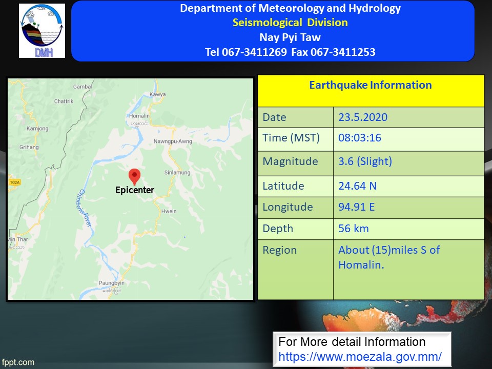 ၂၀၂၀ ပြည့်နှစ်၊ မေလ (၂၃) ရက်နေ့၊ မြန်မာစံတော်ချိန် (ဝ၈)နာရီ၊ (ဝ၃)မိနစ်၊ (၁၆)စက္ကန့် အချိန်တွင် တမူးမြေငလျင်စခန်းမှ အရှေ့မြောက်ဘက် (၄၈)မိုင် ခန့်ကွာဝေးသော၊ မြန်မာနိုင်ငံ ပြည်တွင်း (ဟုမ္မလင်းမြို့၏ တောင်ဘက် (၁၅)မိုင် ခန့်အကွာ)၊ မြောက်လတ္တီတွဒ် (၂၄.၆၄) ဒီဂရီ၊ အရှေ့လောင်ဂျီတွဒ် (၉၄.၉၁) ဒီဂရီ၊ အနက် (၅၆) ကီလိုမီတာကို ဗဟိုပြု၍ အင်အားရစ်(ခ်)တာစကေး (၃.၆)အဆင့်ရှိ အင်အားအနည်းငယ်ရှိသော မြေငလျင်တစ်ခု လှုပ်ရှားသွားကြောင်း တိုင်းထွာ ရရှိပါသည်။
