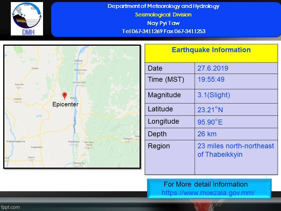 ၂၀၁၉ ခုနှစ် ၊ ဇွန်လ (၂၇)ရက်နေ့ မြန်မာစံတော်ချိန် (၁၉)နာရီ (၅၅)မိနစ် (၄၉) စက္ကန့်အချိန်တွင် ကန့်ဘလူမြေငလျင်စခန်းမှ အရှေ့ဘက် (၂၅) မိုင်ခန့် ကွာဝေးသော မြန်မာနိုင်ငံပြည်တွင်း (သပိတ်ကျင်းမြို့၏ မြောက်-အရှေ့မြောက်ဘက် (၂၃) မိုင်ခန့် အကွာ) မြောက်လတ္တီတွဒ် (၂၃.၂၁)ဒီဂရီ၊ အရှေ့လောင်ဂျီတွဒ် (၉၅.၉၀)ဒီဂရီ၊ အနက် (၂၆) ကီလိုမီတာခန့်ကို ဗဟိုပြု၍ အင်အားရစ်(ခ်)တာစကေး (၃.၁) အဆင့်ရှိ အင်အား အနည်းငယ်ရှိသော မြေငလျင်တစ်ခုလှုပ်ရှားသွားကြောင်း တိုင်းထွာရရှိခဲ့ပါသည်။