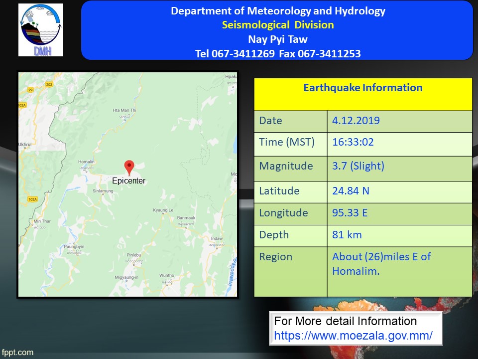 ၂၀၁၉ ခုနှစ်၊ ဒီဇင်ဘာလ (၄)ရက်နေ့၊ မြန်မာစံတော်ချိန် (၁၆)နာရီ၊ (၃၃)မိနစ်၊ (၀၂) စက္ကန့် အချိန်တွင် တမူးမြေငလျင်စခန်းမှ အရှေ့မြောက်ဘက် (၇၇)မိုင် ခန့်ကွာဝေးသော၊ မြန်မာနိုင်ငံပြည်တွင်း၊ (ဟုမ္မလင်းမြို့၏ အရှေ့ဘက် (၂၆) မိုင်ခန့်အကွာ)၊ မြောက်လတ္တီတွဒ် (၂၄.၈၄)ဒီဂရီ၊ အရှေ့လောင်ဂျီတွဒ် (၉၅.၃၃)ဒီဂရီ၊ အနက်(၈၁) ကီလိုမီတာကို ဗဟိုပြု၍ အင်အားရစ်(ခ်)တာစကေး (၃.၇) အဆင့်ရှိ အင်အားအနည်းငယ်ရှိသော မြေငလျင်တစ်ခု လှုပ်ရှားသွားကြောင်း တိုင်းထွာရရှိပါသည်။