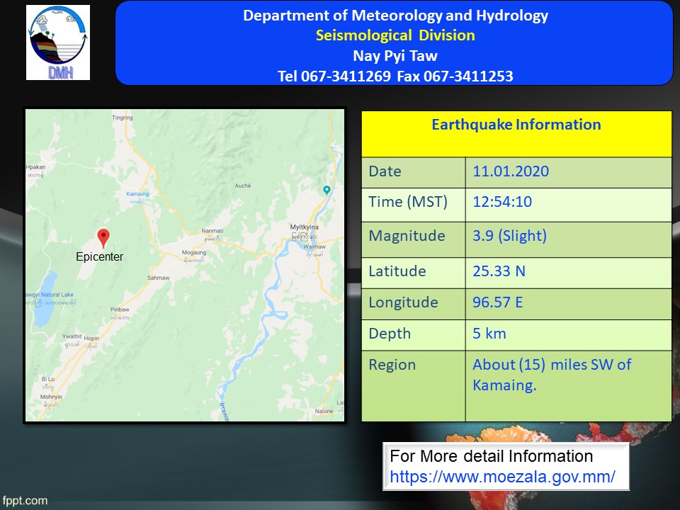 ၂၀၂၀ ပြည့်နှစ်၊ ဇန်နဝါရီလ (၁၁) ရက်နေ့၊ မြန်မာစံတော်ချိန် (၁၂)နာရီ၊ (၅၄)မိနစ်၊ (၁၀) စက္ကန့်အချိန်တွင် မြစ်ကြီးနားမြေငလျင်စခန်းမှ အနောက်-အနောက်တောင်ဘက် (၅၈)မိုင် ခန့်ကွာဝေးသော၊ မြန်မာနိုင်ငံပြည်တွင်း (ကာမိုင်းမြို့၏ အနောက်တောင်ဘက် (၁၅)မိုင် ခန့်အကွာ)၊ မြောက်လတ္တီတွဒ် (၂၅.၃၃) ဒီဂရီ၊ အရှေ့လောင်ဂျီတွဒ် (၉၆.၅၇) ဒီဂရီ၊ အနက် (၅) ကီလိုမီတာကို ဗဟိုပြု၍ အင်အား ရစ်(ခ်)တာစကေး (၃.၉) အဆင့်ရှိ အင်အားအနည်းငယ်ရှိသော မြေငလျင်တစ်ခု လှုပ်ရှားသွားကြောင်း တိုင်းထွာရရှိပါသည်။