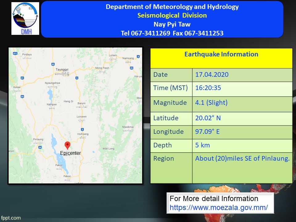 ၂၀၂၀ ပြည့်နှစ်၊ ဧပြီလ (၁၇)ရက်နေ့၊ မြန်မာစံတော်ချိန် (၁၆)နာရီ၊ (၂၀)မိနစ်၊ (၃၅)စက္ကန့် အချိန်တွင် တောင်ကြီးမြေငလျင်စခန်းမှ တောင်ဘက် (၅၂)မိုင် ခန့်ကွာဝေးသော မြန်မာနိုင်ငံ ပြည်တွင်း (ပင်လောင်းမြို့၏ အရှေ့တောင်ဘက် မိုင်(၂၀) ခန့်အကွာ) မြောက်လတ္တီတွဒ် (၂၀.၀၂)ဒီဂရီ၊ အရှေ့လောင်ဂျီတွဒ် (၉၇.၀၉)ဒီဂရီ၊ အနက် (၅)ကီလိုမီတာကို ဗဟိုပြု၍ အင်အား ရစ်(ခ်)တာစကေး (၄.၁) အဆင့်ရှိ အင်အားအနည်းငယ်ရှိသော မြေငလျင်တစ်ခု လှုပ်ရှားသွားကြောင်း တိုင်းထွာ ရရှိပါသည်။
