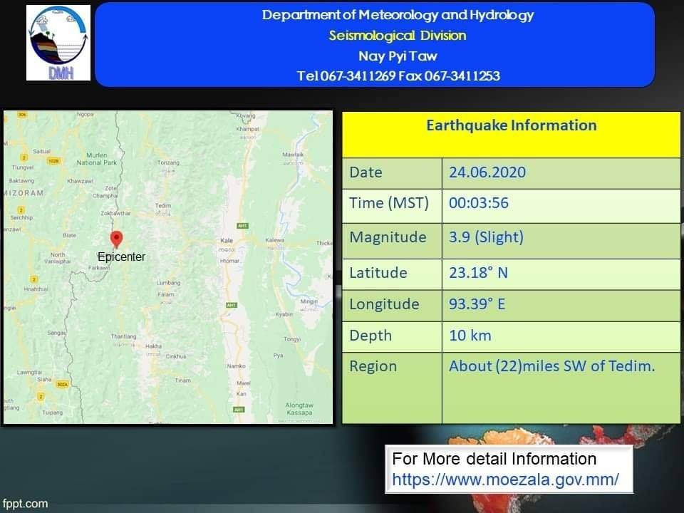 ၂၀၂၀ ပြည့်နှစ်၊ ဇွန်လ (၂၄)ရက်နေ့၊ မြန်မာစံတော်ချိန် (၀၀)နာရီ၊ (၀၃)မိနစ်၊ (၅၆)စက္ကန့် အချိန်တွင် ဟားခါးမြေငလျင်စခန်းမှ အနောက်မြောက်ဘက် (၃၈)မိုင် ခန့်ကွာဝေးသော မြန်မာနိုင်ငံ ပြည်တွင်း (တီးတိန်မြို့၏ အနောက်တောင်ဘက် (၂၂)မိုင် ခန့်အကွာ) မြောက်လတ္တီတွဒ် (၂၃.၁၈)ဒီဂရီ၊ အရှေ့လောင်ဂျီတွဒ် (၉၃.၃၉)ဒီဂရီ၊ အနက် (၁၀)ကီလိုမီတာကို ဗဟိုပြု၍ အင်အား ရစ်(ခ်)တာစကေး (၃.၉) အဆင့်ရှိ အင်အားအနည်းငယ်ရှိသော မြေငလျင်တစ်ခု လှုပ်ရှားသွားကြောင်း တိုင်းထွာ ရရှိပါသည်။