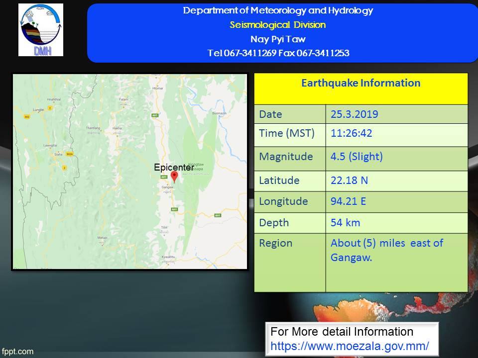 မိုးလေဝသနှင့်ဇလဗေဒညွှန်ကြားမှုဦးစီးဌာနမှ ၂၀၁၉ ခုနှစ်၊ မတ်လ (၂၅) ရက်နေ့၊ မြန်မာစံတော်ချိန် (၁၁)နာရီ၊ (၂၆)မိနစ်၊ (၄၂)စက္ကန့် အချိန်တွင် ဟားခါးမြေငလျင်စခန်းမှ အရှေ့တောင်ဘက် မိုင် (၅၀) ခန့်ကွာဝေးသော မြန်မာနိုင်ငံပြည်တွင်း (ဂန့်ဂေါမြို့၏ အရှေ့ဘက် (၅)မိုင်ခန့်အကွာ) မြောက်လတ္တီတွဒ် (၂၂.၁၈)ဒီဂရီ၊ အရှေ့လောင်ဂျီတွဒ် (၉၄.၂၁) ဒီဂရီ၊ အနက် (၅၄)ကီလိုမီတာကို ဗဟိုပြု၍ အင်အားရစ်(ခ်)တာစကေး (၄.၅) အဆင့်ရှိ အင်အားအနည်းငယ်ရှိသော မြေငလျင်တစ်ခု လှုပ်ရှားသွားကြောင်း တိုင်းထွာရရှိပါသည်။
