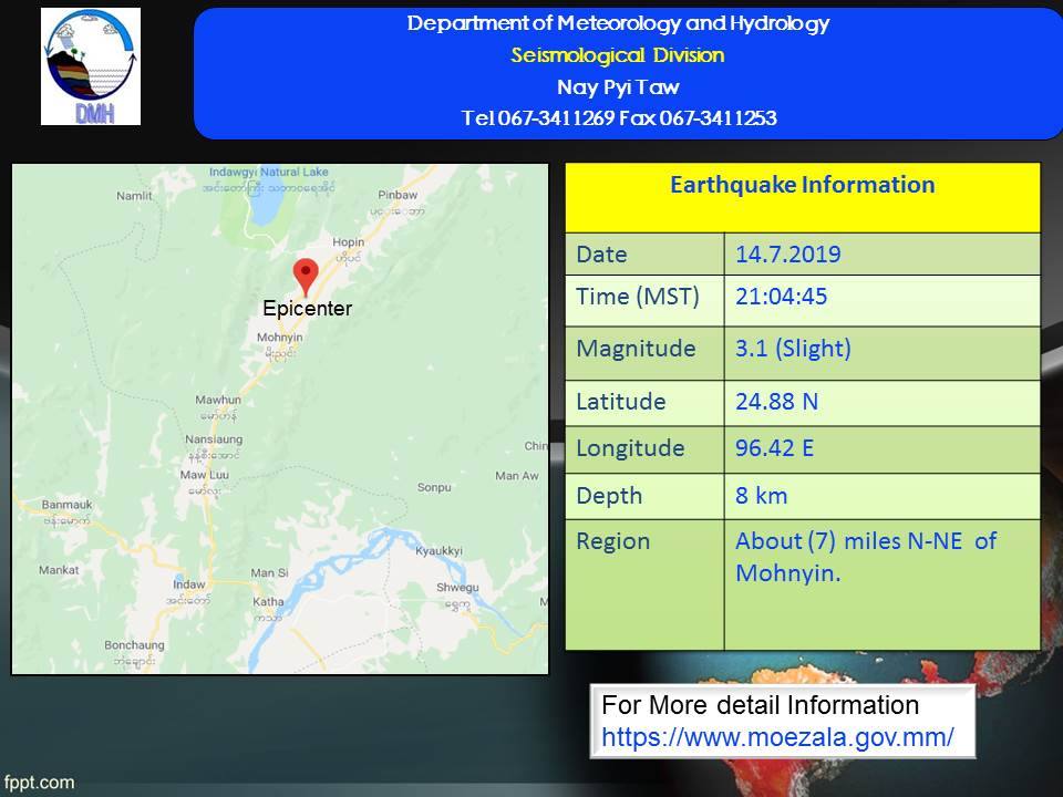 ၂၀၁၉ ခုနှစ်၊ ဇူလှိုင်လ (၁၄) ရက်နေ့၊ မြန်မာစံတော်ချိန် (၂၁)နာရီ၊ (ဝ၄)မိနစ်၊ (၄၅)စက္ကန့် အချိန်တွင် ကသာမြေငလျင်စခန်းမှ မြောက်ဘက် (၄၉)မိုင် ခန့်ကွာဝေးသော မြန်မာနိုင်ငံပြည်တွင်း (မိုးညှင်းမြို့၏ မြောက်-အရှေ့မြောက်ဘက် (၇)မိုင်ခန့်အကွာ) မြောက်လတ္တီတွဒ် (၂၄.၈၈)ဒီဂရီ၊ အရှေ့လောင်ဂျီတွဒ် (၉၆.၄၂) ဒီဂရီ၊ အနက် (၈)ကီလိုမီတာကို ဗဟိုပြု၍ အင်အား ရစ်(ခ်)တာစကေး (၃.၁) အဆင့်ရှိ အင်အားအနည်းငယ်ရှိသော မြေငလျင်တစ်ခု လှုပ်ရှားသွားကြောင်း တိုင်းထွာ ရရှိပါသည်။