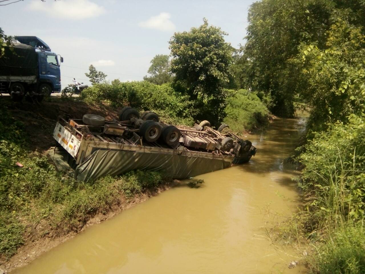 ရန်ကုန်ဘက်မှ မန္တလေးဘက်သို့ ယာဉ်မောင်းညီညီနိုင် (၂၇)နှစ် တောင်သာမြို့ မန္တလေးတိုင်းဒေသကြီး နေသူမောင်းနှင်လာသာ 1I/----- HINO PROFIA FWIEXH အမျိုးအစား ပြာနက်ရောင် ၁၂ ဘီးယာဉ်သည် မြေသြဇာအိတ်များ တင်ဆောင်ပြီး မောင်းနှင်လာစဉ် အရှိန်မထိန်းနိုင်ဘဲ လမ်း၏ယာဘက်ခြမ်း လမ်းဘေးရေမြောင်းအနီးသို့ ထိုးကျတိမ်းမှောက်ခဲ့ရာ ယာဉ်မောင်းညီညီနိုင်နှင့် ယာဉ်နောက်လိုက် စွမ်းထက် (၁၉)နှစ် ညောင်ပင်ကြီးရွာ စဉ့်ကိုင်မြို့နေသူတို့မှာ ထိခိုက်ဒဏ်ရာ မရရှိသော်လည်း ယာဉ်မှာ ရှေ့လေကာမှန်ကွဲ၊ ဘော်ဒီပိန်ချိုင့် အမိုးကိုင်းကျိုး၍ ပျက်စီးခဲ့သည်။