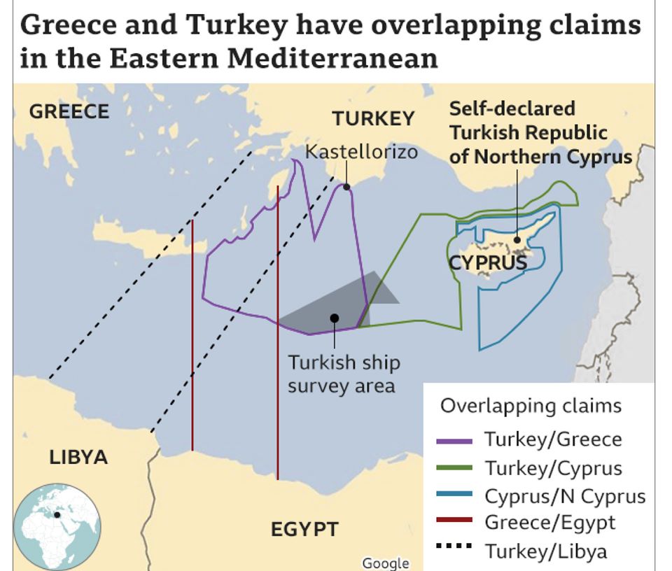 တူရကီနဲ့ ဂရိနှစ်နိုင်ငံလုံးက သူပိုင်တယ်၊ ငါပိုင်တယ် ဆိုပြီး အငြင်းပွားနေတဲ့ ရေပိုင်နက်ထဲမှာ တူရကီရဲ့ Oruc Reis သုတေသနသင်္ဘောက ရေနံနဲ့ဓာတ်ငွေ့တူးဖော် ရှာဖွေရေး လုပ်ဆောင်နေပါတယ်။ ဩဂုတ် ၁၃ ရက်မှာ တူရကီသမ္မတ ရီဆက်တေယစ်အာဒိုဂန်က တူရကီရဲ့ သုတေသနသင်္ဘောကိုလာပြီး တိုက်ခိုက်နှောင့်ယှက်တဲ့ ဘယ်သူမဆို တန်ဖိုးကြီးကြီးမားမား ပြန်ပေးဆပ် ရလိမ့်မယ်လို့ သတိပေးလိုက်ပါတယ်။