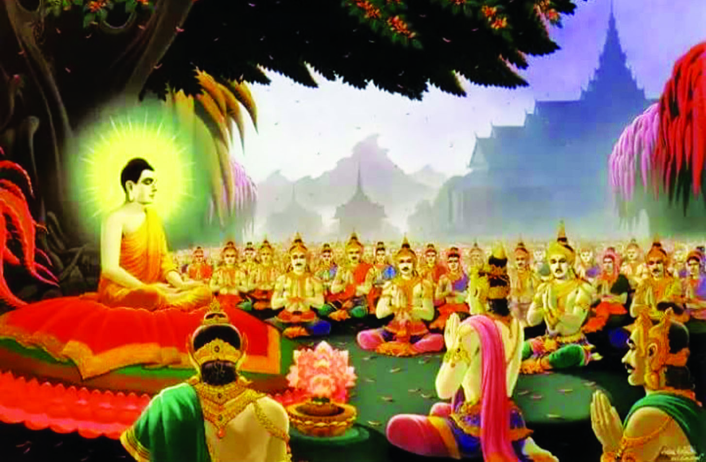 “အေးပေါ့ကွယ်၊ ဒါဆိုလည်း ဘကြီးကောင်း ဆက်ပြောပြမယ်။ ခုနက ရဟန်းတော်များဟာ ဇနီးမယားကို အောက်မေ့တမ်းတ သတိရပြီး သာသနာ့ဘောင်မှာ မပျော်မွေ့နိုင်ဘဲရှိကြရာမှ မြတ်စွာဘုရားက ဟိမဝန္တာတောအတွင်းက ကုဏာလရေအိုင်ကို တန်ခိုးတော်နဲ့ ခေါ်ဆောင် သွားပြီး ကုဏာလငှက်မင်းရဲ့ ဇာတ်ကြောင်းကို ဟောပြောတော်မူတယ်။ တရားအဆုံးမှာ ရဟန်း ငါးရာစလုံး သောတာပန် ဖြစ်သွားကြတယ်။ ကပိလဝတ်ပြည် အနီးက မဟာဝုန်တောကြီးမှာ တရားတော်ကို ဆက်လက်အားထုတ်ကြရာမှာ ရဟန်းတော်ငါးရာလုံး ရဟန္တာချည်းဖြစ်တော်မူ သွားကြတယ်။ ရဟန်းငါးရာတို့ဟာ မိမိတို့ ရရှိပြီး သောတရားထူးကို လျှောက်တင်ဖို့ရယ်၊ မြတ်စွာ ဘုရားကိုဖူးမြော်ဖို့ရယ် နယုန်လပြည့် ညချမ်း အချိန်မှာ မြတ်စွာဘုရားထံကို စုရုံးရောက်ရှိလာကြ တယ်။ ဒီလိုထူးခြားတဲ့ သံဃာ့အစည်းအဝေးကြီးကို တွေ့မြင်ကြည်ညိုလိုကြတဲ့ နတ်၊ ဗြဟ္မာ၊ အသူရာ၊ ဂဠုန်၊ နဂါးတို့ဟာ မဟာဝုန်တောကြီးဆီကို အုပ်စု လိုက် စုရုံးရောက်ရှိလာကြတယ်။