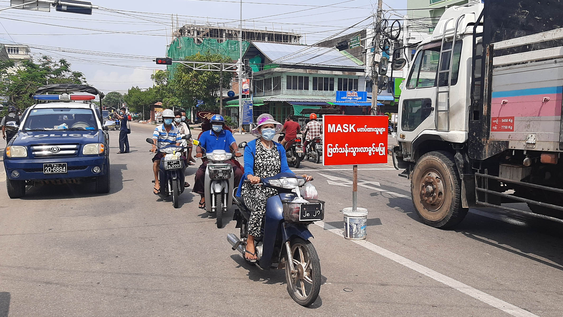 ကိုဗစ်-၁၉ ကာကွယ်ထိန်းချုပ်ရေးအတွက် ယနေ့ နံနက်ပိုင်းက အသွားအလာများသည့် နေရာ လေးနေရာတွင် နှာခေါင်းစည်း မတပ်ဆင်ထားသူများကို စစ်ဆေးရေးအဖွဲ့များက သွားလာခွင့်မပြုဘဲ ပညာပေး၍ လှည့်ပြန်စေကာ နှာခေါင်းစည်း ပြန်လည်တပ်ဆင်စေလျက်ရှိသည်။