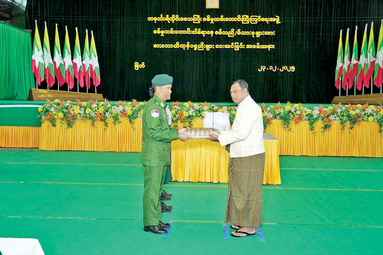 ဦးစွာ တိုင်းမှူးက အမှာစကားပြောကြားပြီး စစ်မှုထမ်းဟောင်းအဖွဲ့ဝင်များနှင့် မိသားစုဝင်များ၏ တင်ပြချက်များအပေါ် လိုအပ်သည်များ ပေါင်းစပ်ညှိနှိုင်း ဆောင်ရွက်ပေးသည်။ ထို့နောက် တိုင်းမှူးနှင့် တာဝန်ရှိသူများက စစ်မှုထမ်းဟောင်းအဖွဲ့ဝင်များနှင့် မိသားစုဝင်များအား ဆန်၊ ဆီ၊ ကြက်ဥနှင့် စားသောက်ဖွယ်ရာများ ပေးအပ်ရာ တာဝန်ရှိသူများက လက်ခံရယူကြသည်။