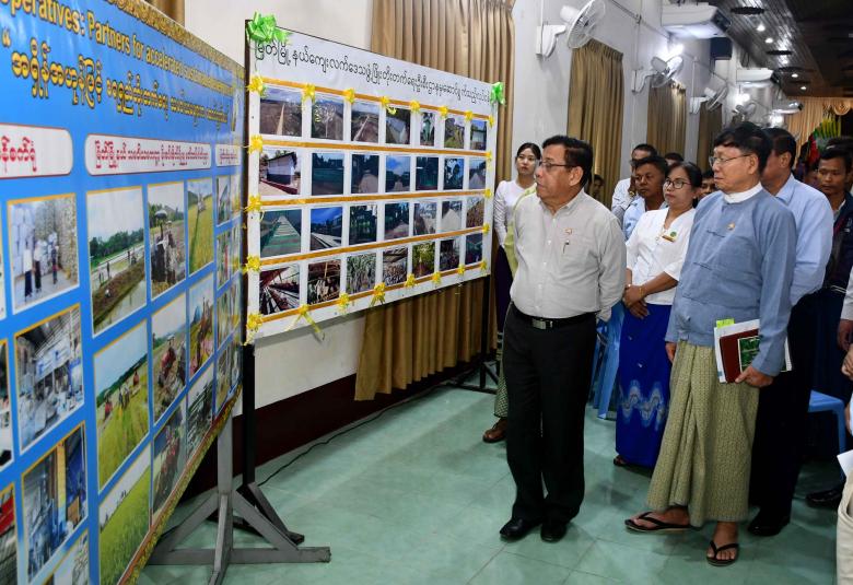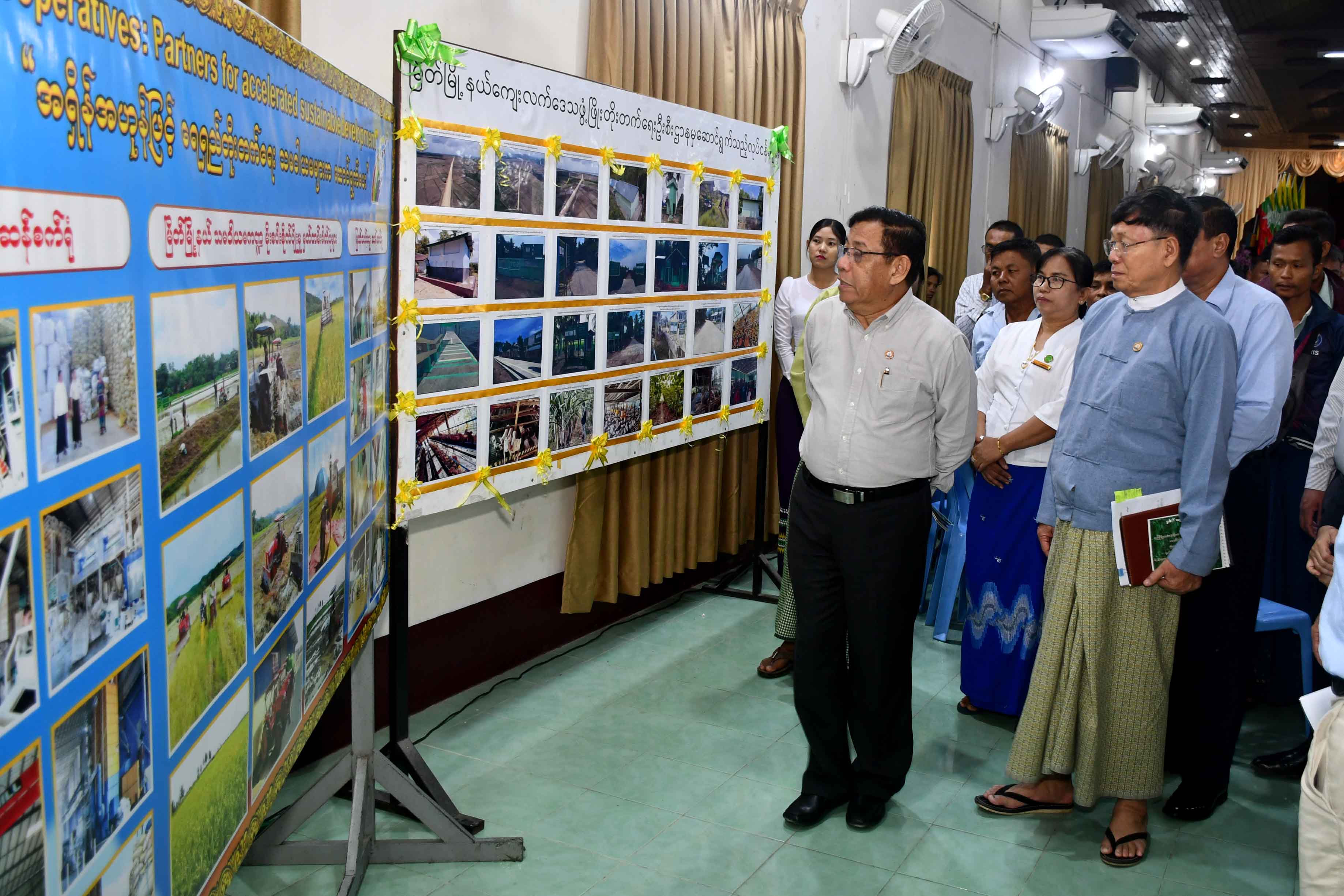 ဆက်လက်၍ ဝန်ကြီးချုပ်နှင့်အဖွဲ့သည် သမဝါယမဦးစီးဌာန၊ ကျေးလက်ဒေသဖွံ့ဖြိုးရေးဦးစီးဌာန၊ အသေးစားစက်မှုလက်မှုလုပ်ငန်း ဦးစီးဌာနတို့မှ ခန်းမအတွင်းပြသထားသည့် အရှိန်အဟုန်ဖြင့် ရှေရှည်ဖွံ့ဖြိုးတိုးတက်ရေး သမဝါယမများက ဆောင်ရွက်ပေး၊ သမဝါယမကဏ္ဍ မိုးစပါးတစ်ဧကအထွက်နှုန်း တိုးတက်ရေး မတည်ချေးငွေထုတ်ချေးပေး၊ ဒေသဝမ်းစာဖူလုံရေး သမဝါယမက ကူညီဆောင်ရွက်ပေး ခေါင်းစဉ်များနှင့် ပြည်သူ့အကျိုးပြုလုပ်ငန်း ဆောင်ရွက်မှု ပြခန်းများအား ကြည့်ရှုအားပေးခဲ့ကြသည်။