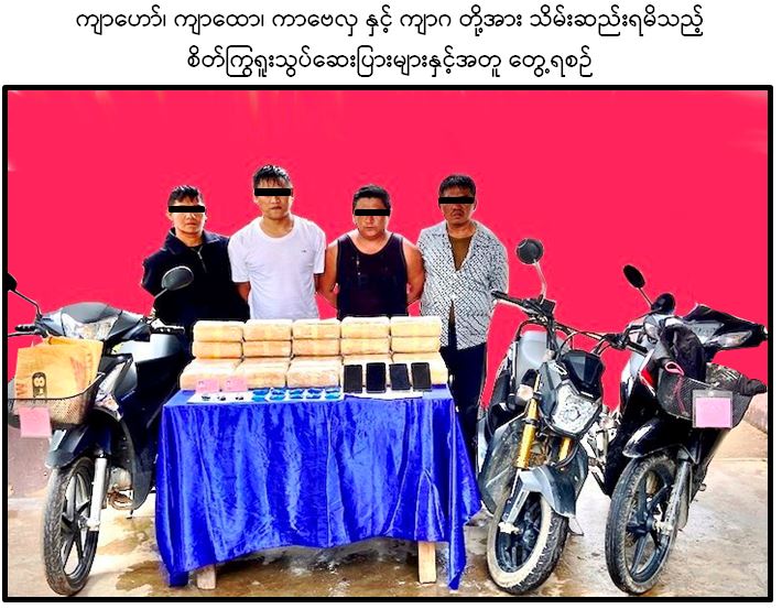 မူးယစ်ဆေးဝါးတားဆီးနှိမ်နင်းရေးရဲ တပ်ဖွဲ့ဝင်များပါဝင်သော ပူးပေါင်းအဖွဲ့သည် စက်တင်ဘာ ၈ ရက် နံနက် ၁၁ နာရီ မိနစ် ၂၀ တွင် မြိတ်မြို့၊ မြိတ်တောင်ရပ်ကွက်၊ စက်ဝန်းရပ်၊ ပိတောက် ရွှေဝါလမ်းပေါ်တွင် မသင်္ကာဖွယ်တွေ့ရှိသူ မအင်ဌေး(ခ)အေးချိုကို ရှာဖွေရာ စိတ်ကြွရူးသွပ်ဆေးပြား ၁၀,၀၀၀ ကိုလည်းကောင်း၊ အလားတူ ပူးပေါင်းအဖွဲ့သည် စက်တင်ဘာ ၉ ရက် မွန်းလွဲ ၁၂ နာရီခွဲတွင် ကျိုင်းတုံမြို့၊ ရပ်ကွက်(၃)အတွင်းတွင် ကာဗေလှ မောင်းနှင်ပြီး ကျာဂ လိုက်ပါလာသည့် ဆိုင်ကယ်၊ ကျထော မောင်းနှင်လာသည့် ဆိုင်ကယ်နှင့် ကျာဟော် မောင်းနှင် လာသည့် ဆိုင်ကယ်တို့ကို ရပ်တန့်စစ်ဆေးရှာဖွေရာ  စိတ်ကြွရူးသွပ် ဆေးပြား ၃၀၀,၀၀၀ ကို လည်းကောင်း သိမ်းဆည်းရမိခဲ့သဖြင့် ၎င်းတို့အား မူးယစ်ဆေးဝါးနှင့်စိတ်ကိုပြောင်းလဲစေသော ဆေးဝါးများဆိုင်ရာ ဥပဒေအရ အရေးယူထားကြောင်း သိရသည်။