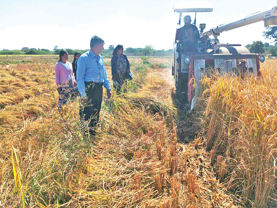 မန္တလေးတိုင်းဒေသကြီး မိတ္ထီလာမြို့နယ်သမဝါယမဦးစီးဌာန ဦးစီးအရာရှိနှင့် တာဝန်ရှိသူများသည် မကျီးပင်ပုကျေးရွာ မကျီးပင်ပု (အရှေ့)စိုက်ပျိုးရေးနှင့် အထွေထွေလုပ်ငန်း သမဝါယမအသင်းမှ အသင်းသား ဦးဌေးဝင်း၏ လယ်မြေ ငါးဧကတွင် ဧရာမင်းစပါးများ ရိတ်သိမ်းနေမှုကို ယမန်နေ့က ကြည့်ရှုအားပေးသည်။