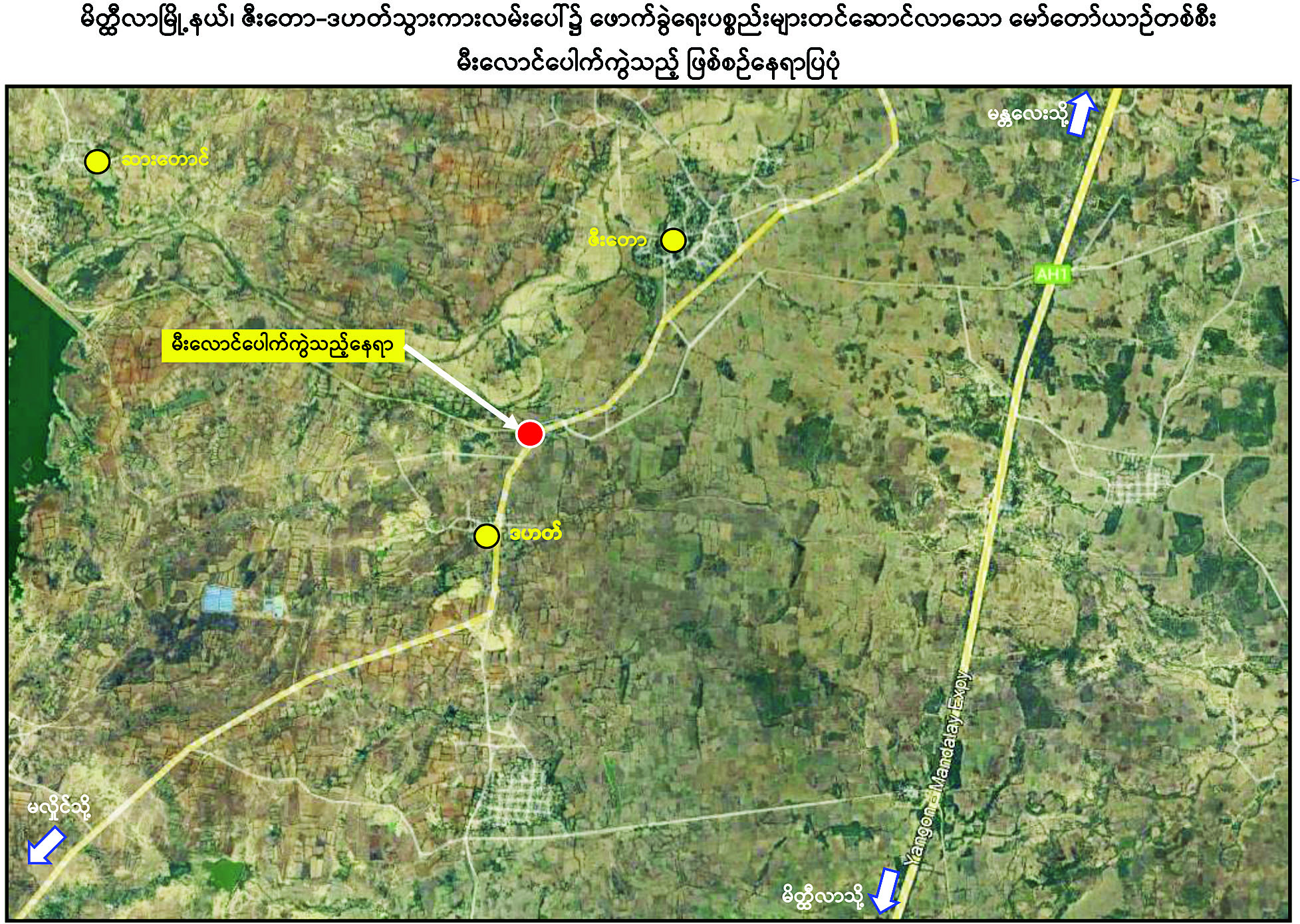 ထိုသို့ စစ်ဆေးမှုများဆောင်ရွက်လျက်ရှိရာ မန္တလေးတိုင်းဒေသကြီး မိတ္ထီလာမြို့နယ်အတွင်း လုံခြုံရေးဆောင်ရွက်နေသော တပ်ဖွဲ့ဝင်များသည် ယနေ့ နံနက်ပိုင်းတွင် မိတ္ထီလာမြို့နယ် ဇီးတော-ဒဟတ်သွား ကျေးရွာချင်းဆက်မြေသားလမ်းပေါ်၌ ရှာဖွေစစ်ဆေးမှုများဆောင်ရွက်စဉ် ဆားတောင်ဘက်မှ ဇီးတောဘက်သို့ မောင်းနှင်လာသော Hiace ခဲရောင် (လိုင်စင်စိစစ်ဆဲ) မော်တော်ယာဉ်တစ်စီးအား မသင်္ကာဖွယ်တွေ့ရှိသဖြင့် အစစ်ဆေးခံရန် ရပ်တန့်စေခဲ့ရာ အဆိုပါမော်တော်ယာဉ်မှာ ရပ်တန့်မှုမရှိဘဲ မောင်းနှင်ထွက်ပြေးသွားစဉ် တိမ်းမှောက်မှုဖြစ်ပေါ်ခဲ့ရာမှ ယာဉ်ပေါ်တွင်ပါလာသည့် ပေါက်ကွဲစေတတ်သောပစ္စည်းများဟု ယူဆရသည့် ပစ္စည်းများကြောင့် မော်တော်ယာဉ်မှာ ပေါက်ကွဲပြီး မီးလောင်သွားခဲ့ကြောင်း သိရသည်။