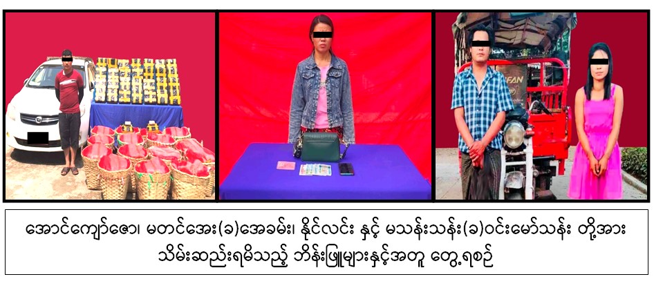 မတ် ၂၉ ရက် မွန်းလွဲ ၁၂ နာရီခွဲတွင် မူးယစ်ဆေးဝါး တားဆီးနှိမ်နင်းရေး ရဲတပ်ဖွဲ့မှတပ်ဖွဲ့ဝင်များ ပါဝင်သော ပူးပေါင်းအဖွဲ့သည် နောင်ချိုမြို့၊ ပါဟက်ရပ်ကွက်၊ အိုရီယမ်တယ် တိုးဂိတ်အနီး၊ မန္တလေး - လားရှိုးသွား ကားလမ်းတွင် အောင်ကျော်ဇော မောင်းနှင်လာသည့် TOYOTA FIELDER အမျိုးအစား မော်တော်ယာဉ်ကို ရပ်တန့်စစ်ဆေးရှာဖွေရာ ဘိန်းဖြူ ၃ ဒသမ ၃ ကီလို သိမ်းဆည်းရမိခဲ့ပြီး ကွင်းဆက်အရ မတ် ၃၀ ရက် မွန်းလွဲ ၁၂ နာရီ ၁၅ မိနစ်တွင် မတင်အေး (ခ) အေခမ်းအား မံစီမြို့၊ ဂျိန်းဖော့မြေရပ်ကွက်၊ ဇော်ဂျွန်းလမ်းဆုံ၌ မြန်မာငွေကျပ် ၅ သိန်းဖြင့်လည်းကောင်း၊ မွန်းလွဲ ၁၂ နာရီခွဲတွင် နိုင်လင်းအား ရွှေကူမြို့၊ အမှတ် (၃) ရပ်ကွက်ရှိ ကားဂိတ်၌ သုံးဘီးမော်တော် ဆိုင်ကယ်တစ်စီးဖြင့်လည်းကောင်း၊ မွန်းလွဲ ၁ နာရီတွင် မသန်းသန်း (ခ) ဝင်းမော်သန်း ကို ရွှေကူမြို့၊ အမှတ် (၄) ရပ်ကွက်ရှိ ၎င်း၏နေအိမ်၌လည်းကောင်း ဖမ်းဆီးရမိခဲ့သဖြင့် ၎င်းတို့အား မူးယစ်ဆေးဝါးနှင့် စိတ်ကိုပြောင်းလဲစေသော ဆေးဝါးများဆိုင်ရာဥပဒေအရ အရေးယူထားကြောင်း သိရသည်။