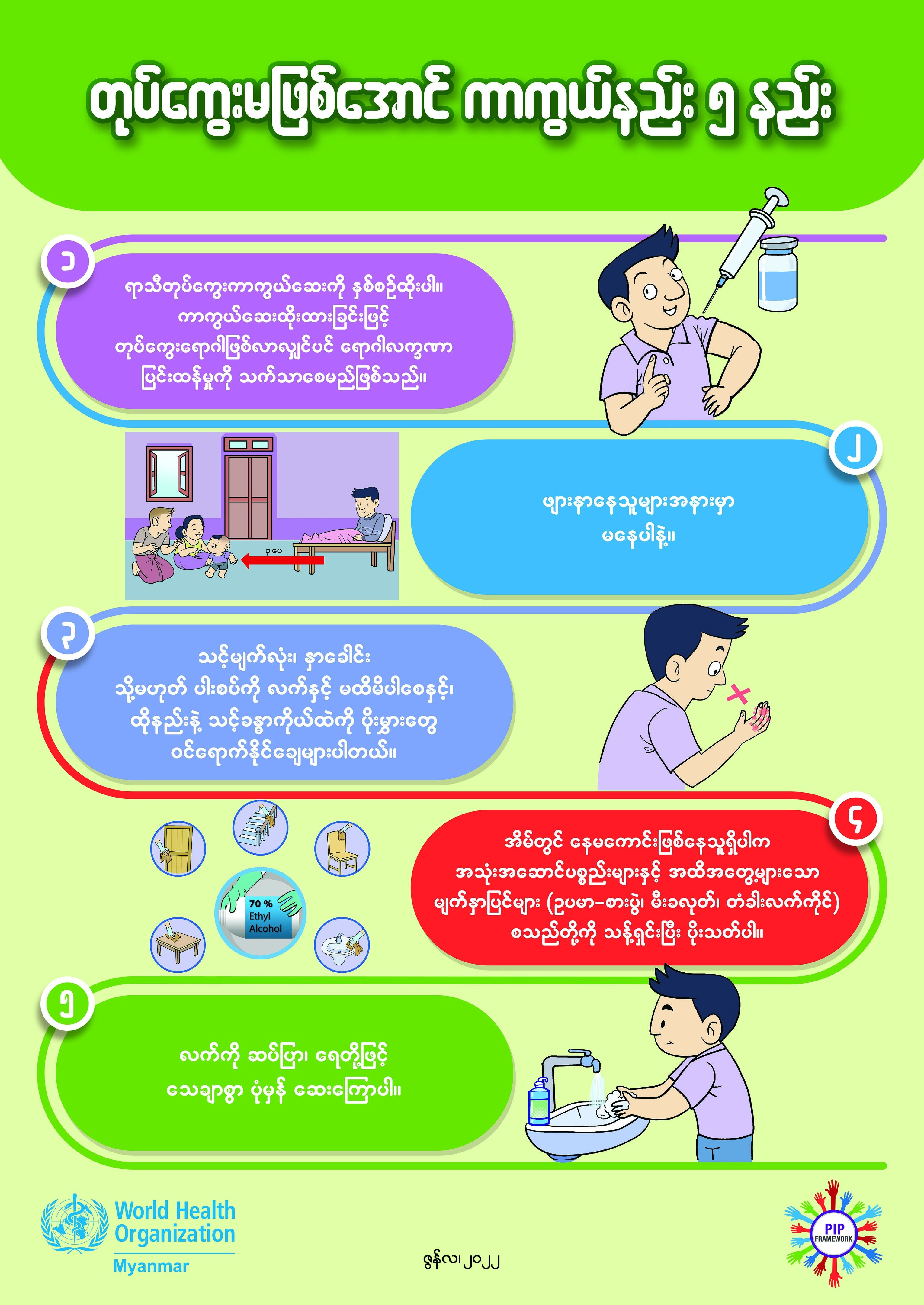 လက်ကို မကြာခဏဆေးခြင်းသည် ရာသီတုပ်ကွေးရောဂါ၊ ကိုဗစ်ရောဂါတို့ကို ကာကွယ်ရာတွင် ထိရောက်သော နည်းလမ်းတစ်ခုဖြစ်သည်။ လက်ကိုမကြာခဏဆေးခြင်းဖြင့် အသက်ရှူလမ်းကြောင်း ဆိုင်ရာရောဂါများကို ကာကွယ်ပေးနိုင်ရုံသာမက ဝမ်းရောဂါနှင့် လက်မှတစ်ဆင့် ကူးစက်နိုင်သော ရောဂါအများစုကို ကာကွယ်ပေးနိုင်ပါသည်။ ရေနှင့် ဆပ်ပြာကို အသုံးပြုကာ စက္ကန့် ၂၀ ခန့် လက်ကို မကြာခဏဆေးခြင်းသည် တုပ်ကွေးရောဂါကို ကာကွယ်ရာတွင် ထိရောက်အကျိုးရှိလှသည်။ လက်ဆေးရာတွင် "ဖဝါး၊ ဖမိုး၊ လက်ခေါက်ချိုး၊ လက်ကြား၊ လက်မမကျန်စေရ၊ ကုတ်၍ခြစ်ပါ လက္ခဏာ၊ လက်ကောက်ဝတ်မှာ အဆုံးသတ်ပါ" ဟူသည့်စာချိုးလေးအတိုင်း လက်ကိုသေသေချာချာ မကြာခဏဆေးသင့်ပါသည်။ ရေနှင့် ဆပ်ပြာအလွယ်တကူ မရနိုင်သောနေရာများတွင် ရေမလိုလက်သန့် ဆေးရည်များ အသုံးပြုသင့်ပါသည်။ ရေနှင့်ဆပ်ပြာ အသုံးပြုကာ လက်ဆေးခြင်း၊ ရေမလိုလက်သန့်ဆေးဖြင့် လက်ဆေးခြင်း စသည့်အလေ့အထများသည် ထာဝစဉ်စွဲမြဲစွာ ပြုလုပ်သင့်သည့် အလေ့အကျင့် ကောင်းများဖြစ်ပါသည်။