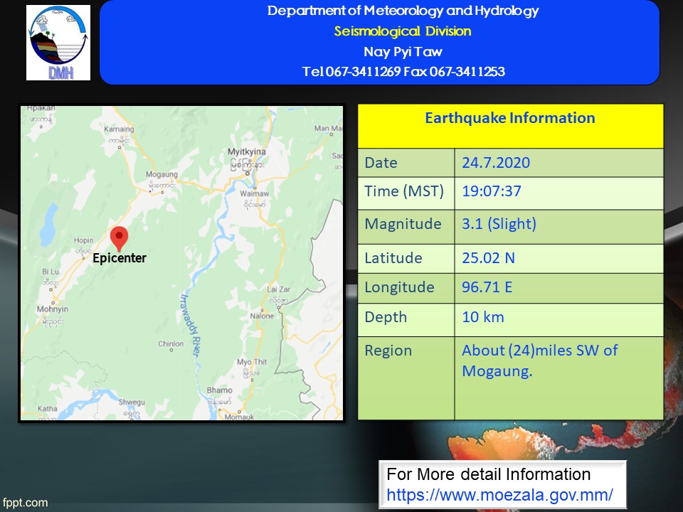 ၂၀၂၀ ပြည့်နှစ်၊ ဇူလိုင်လ (၂၄) ရက်နေ့၊ မြန်မာစံတော်ချိန် (၁၉)နာရီ၊ (၀၇)မိနစ်၊ (၃၇)စက္ကန့် အချိန်တွင် မြစ်ကြီးနားမြေငလျင်စခန်းမှ အနောက်တောင်ဘက် (၅၉)မိုင်ခန့်ကွာဝေးသော မြန်မာနိုင်ငံပြည်တွင်း (မိုးကောင်းမြို့၏ အနောက်တောင်ဘက် (၂၄)မိုင် ခန့်အကွာ)၊ မြောက်လတ္တီတွဒ် (၂၅.၀၂)ဒီဂရီ၊ အရှေ့လောင်ဂျီတွဒ် (၉၆.၇၁)ဒီဂရီ၊ အနက် (၁၀) ကီလိုမီတာကို ဗဟိုပြု၍ အင်အားရစ်(ခ်)တာစကေး (၃.၁) အဆင့်ရှိ အင်အားအနည်းငယ်ရှိသော မြေငလျင်တစ်ခု လှုပ်ရှားသွားကြောင်း တိုင်းထွာရရှိပါသည်။