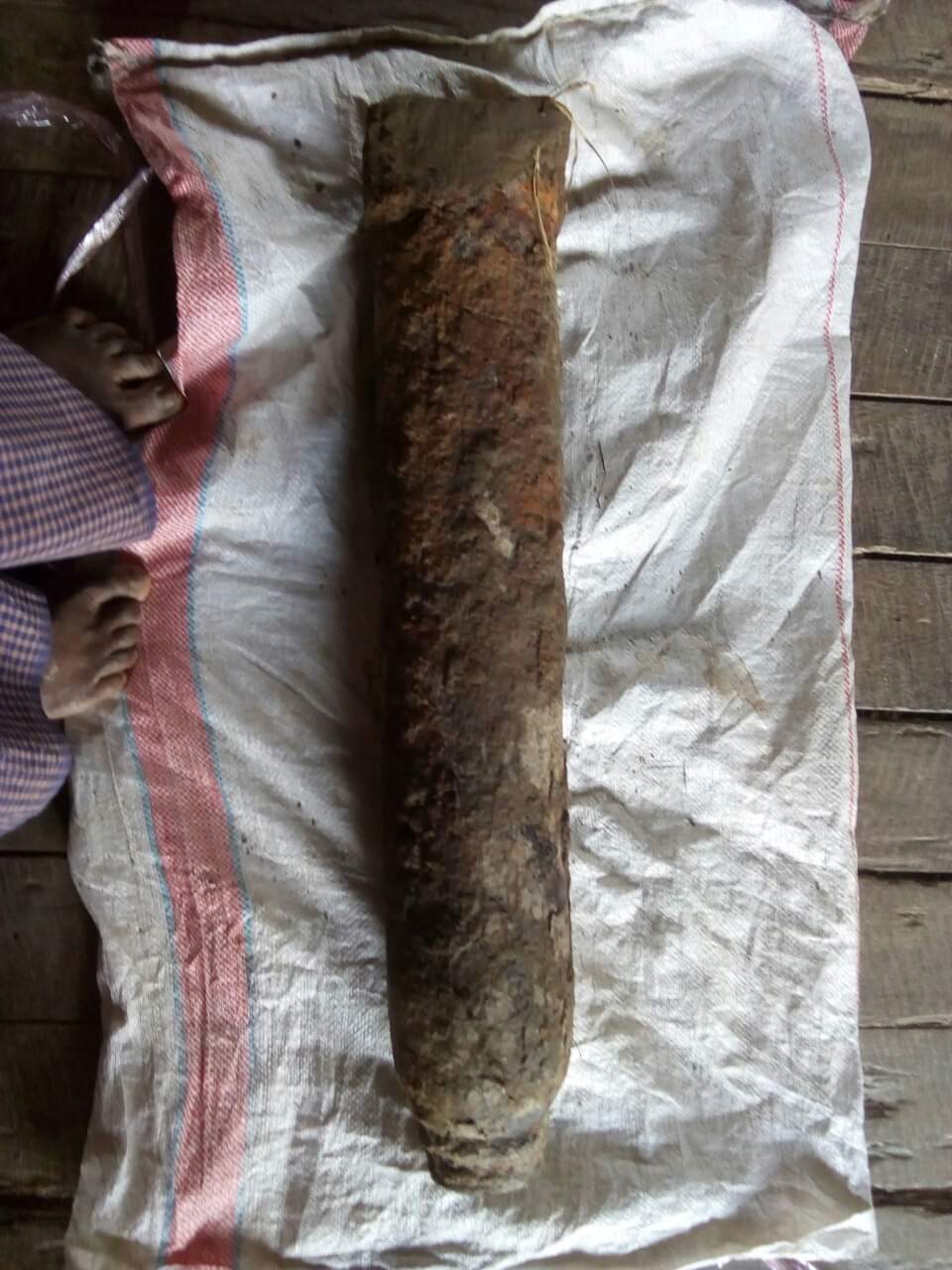 မွန်းလွဲ ၁ နာရီခန့်တွင် ပင်းဘောနယ်မြေရဲစခန်းမှူး ရဲအုပ် လှမင်းပြည့်နှင့် တောင်နီကျေးရွာအုပ်ချုပ်ရေး အဖွဲ့ဝင်များက အဆိုပါနေရာသို့ သွားရောက်ကြည့်ရှုရာ အရှည်နှစ်ပေလေးလက်မခန့်၊ ထိပ်ဖူးအကျယ်သုံးလက်မ၊ နောက်ပိတ်အကျယ်ငါးလက်မခန့်ရှိ သံချေးတက်နေသည့် စစ်ကျန် ဗုံးသီးဟောင်းတစ်လုံးကို တွေ့ရှိခဲ့၍ ကျေးရွာအုပ်ချုပ်ရေးမှူးရုံးသို့ သယ်ဆောင်ထိန်းသိမ်းထားရှိကာ သက်ဆိုင်ရာနယ်မြေခံတပ်သို့ အပ်နှံသွားမည်ဖြစ်ကြောင်း သိရသည်။