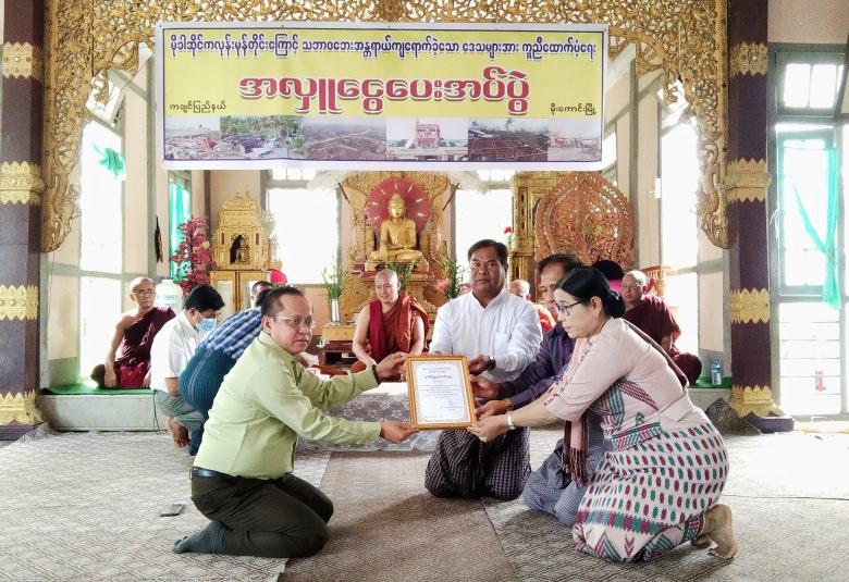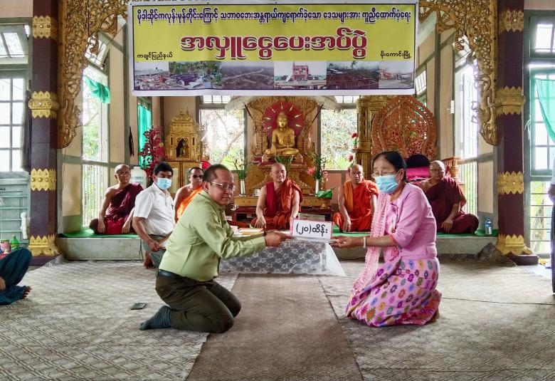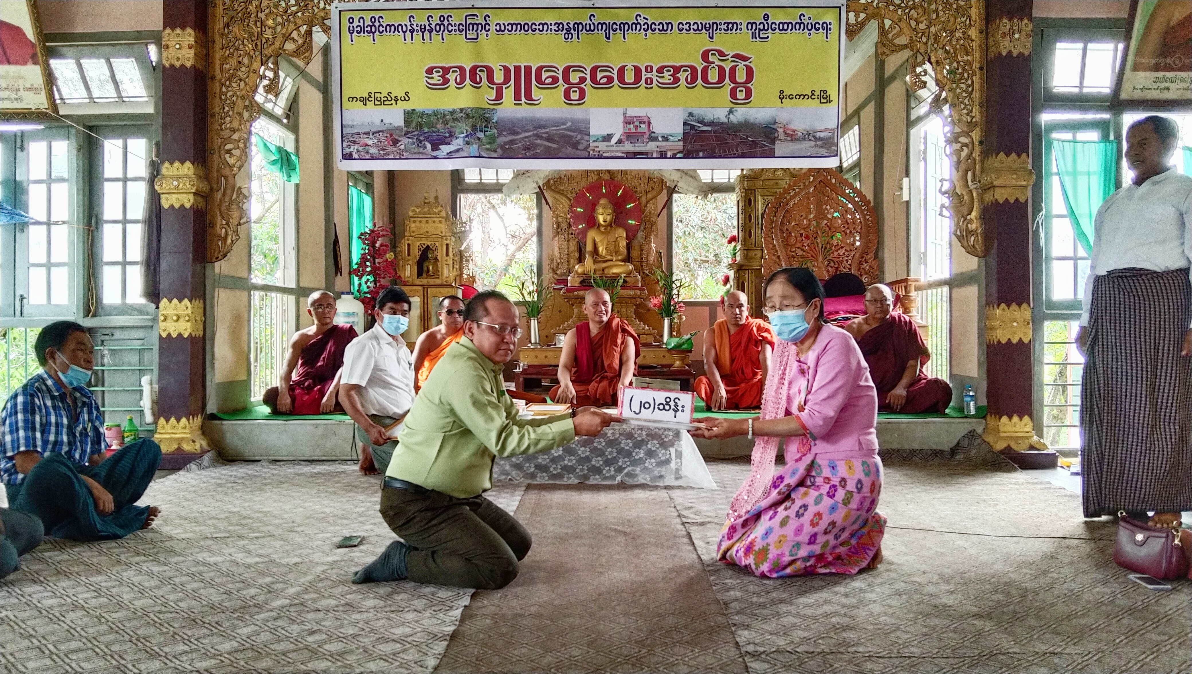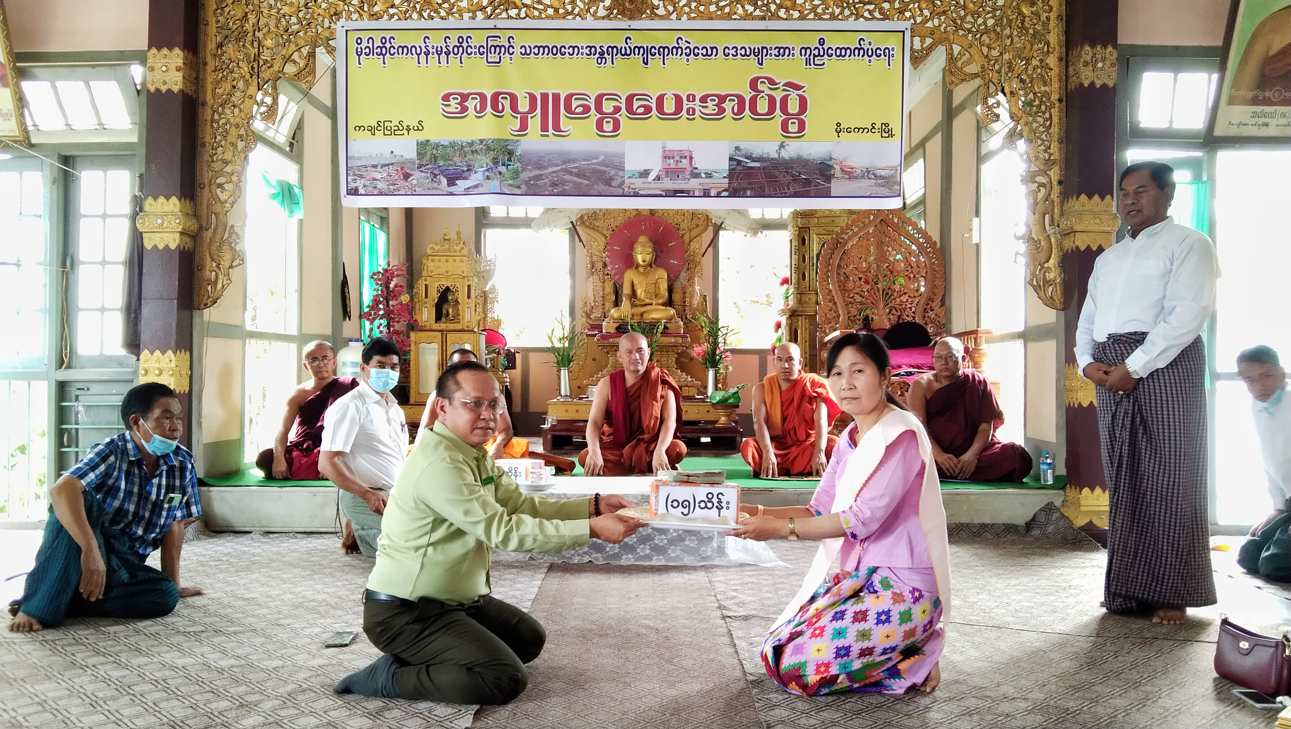 ထို့နောက် မြို့နယ်သဘာဝဘေးအန္တရာယ်ဆိုင်ရာ စီမံခန့်ခွဲမှုအဖွဲ့ဥက္ကဋ္ဌမှ တာဝန်ခံ၍ အလှူခံထားရှိပြီး ထောက်ပံ့လှူဒါန်းခဲ့ကြသော ဦးမောင်ကြီးဇနီး ဒေါ်တင်တင်အုန်း၊ သားမောင်စိုးလှိုင်မြင့်၊ မြင့်ထွန်းဦးကျောက်စိမ်း ကျောက်မျက်ကုမ္ပဏီလီမိတက်မိသားစုမှ ကျပ်သိန်း(၅၀)၊ ဈေးကုန်းရပ်ကွက်နေ ဦးညွှန့်အောင်နှင့်ဇနီး ဒေါ်သန်းသန်းမြင့်မိသားစုမှ ကျပ်သိန်း(၂၀)၊ ကိုစိုးလှိုင်ဦးနှင့်ဇနီး မရတနာခင် မိသားစု(ရန်ကုန်)မှ ကျပ်(၁၅)သိန်းနှင့် ကိုစိုးနိုင်ထွန်းဇနီး မခင်ခက်ခက်ခိုင် မိသားစု (ရန်ကုန်)မှ ကျပ်(၁၅)သိန်း စုစုပေါင်းကျပ်သိန်း(၁၀၀)အား အလှူရှင်များက မြို့နယ်သဘာဝဘေးအန္တရာယ်ဆိုင်ရာ စီမံခန့်ခွဲမှုအဖွဲ့ ဥက္ကဋ္ဌထံ ပေးအပ်လှူဒါန်းခဲ့ကြောင်း သိရသည်။
