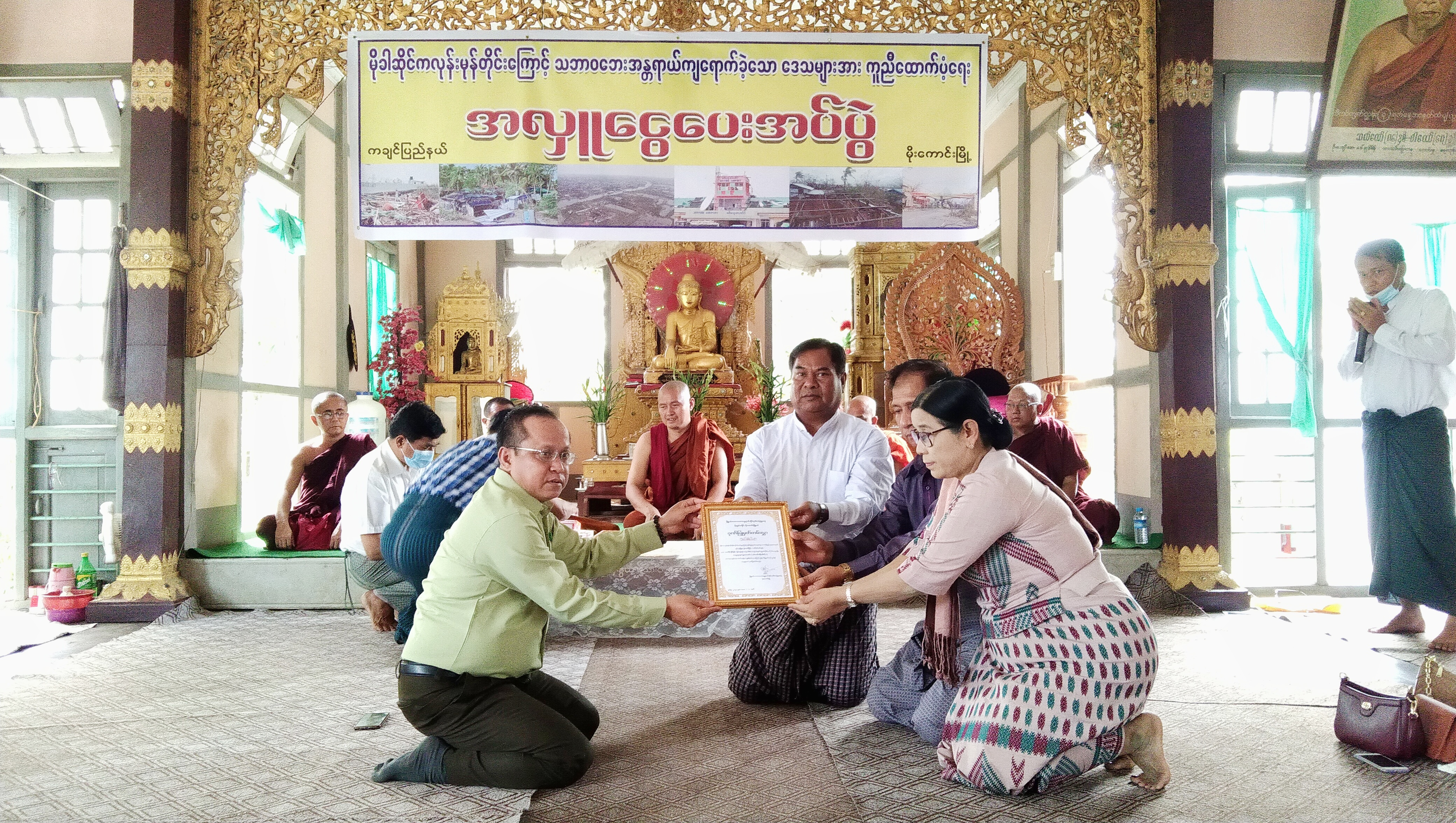 မိုခါဆိုင်ကလုန်းမုန်တိုင်းကြောင့် သဘာဝဘေးအန္တရာယ်ကျရောက်ခဲ့သော ဒေသများအား ကူညီထောက်ပံ့ပေးရန်အတွက် ကချင်ပြည်နယ်၊ မိုးကောင်းမြို့ မဟာသမယကျောင်းတိုက်၌ ယနေ့ နံနက် ၁၀ နာရီတွင် ထောက်ပံ့ငွေပေးအပ်ပွဲ ကျင်းပခဲ့သည်။