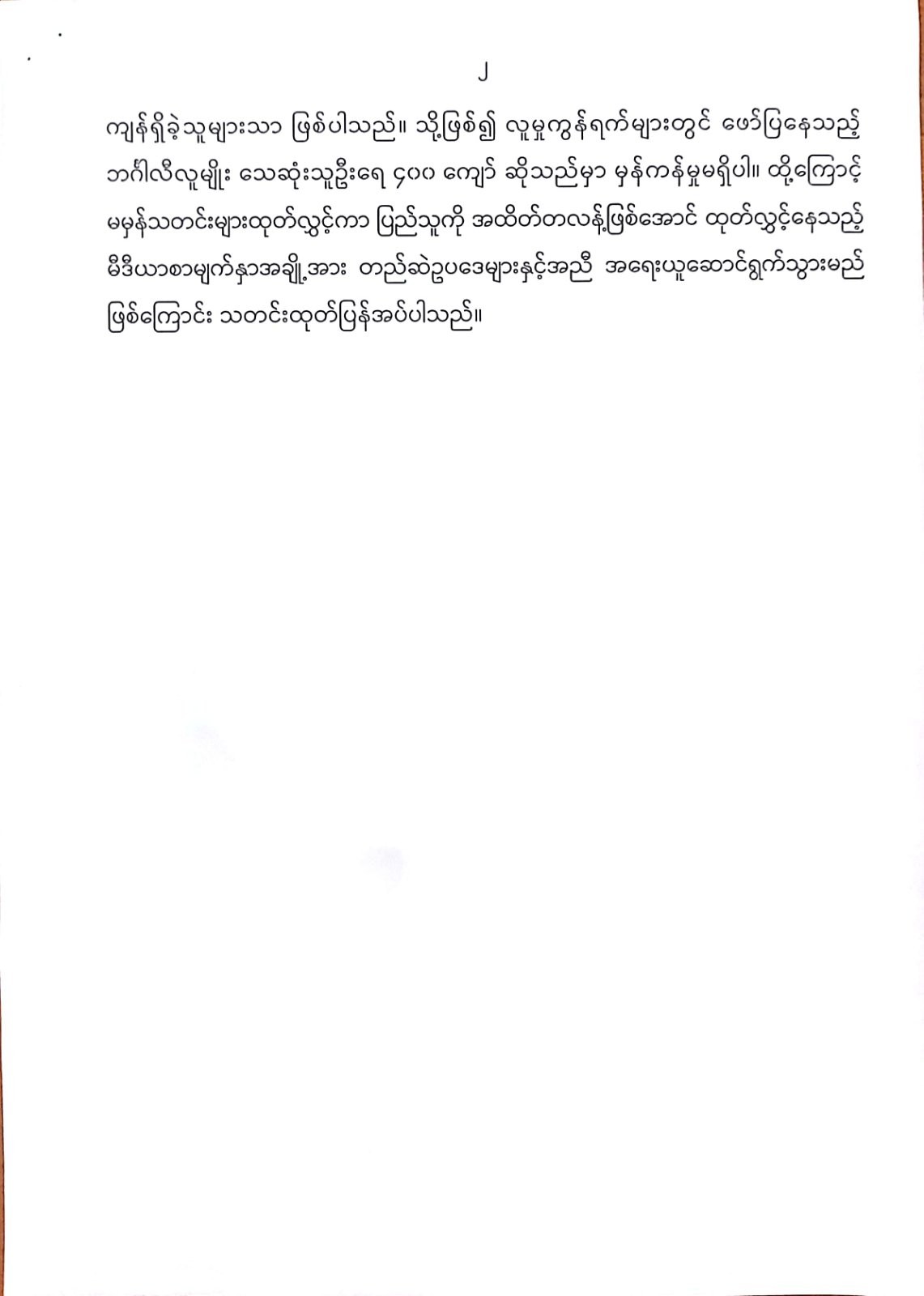 ပြည်ထောင်စုသမ္မတမြန်မာနိုင်ငံတော် ယာယီသမ္မတ နိုင်ငံတော်လုံခြုံရေးနှင့် အေးချမ်းသာယာရေး ကော်မရှင်ဥက္ကဋ္ဌ ဗိုလ်ချုပ်မှူးကြီး သတိုးမဟာသရေစည်သူ သတိုးသီရိသုဓမ္မ မင်းအောင်လှိုင်ထံမှ (၇၄) နှစ်မြောက် ကယားပြည်နယ်နေ့အခမ်းအနားသို့ပေးပို့သည့် သဝဏ်လွှာ