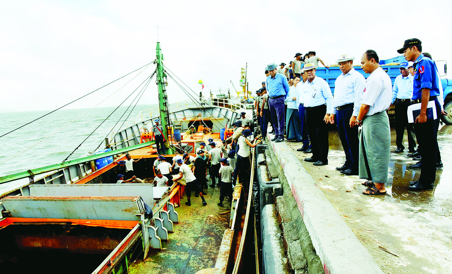 ထို့နောက် ဗိုလ်ချုပ်ကြီး တင်အောင်စန်းနှင့်အဖွဲ့သည် မြန်မာ့ဆိပ်ကမ်းအာဏာပိုင် ဖောင်တော်ကြီး ဆိပ်ခံတံတား၌ ဆိုက်ကပ်ထားသည့် ပြည်တော်အေး-၄ သင်္ဘောပေါ်မှ ကူညီကယ်ဆယ်ရေးနှင့် ပြန်လည်ထူထောင်ရေးလုပ်ငန်းများတွင် အသုံးပြုမည့် ပစ္စည်းများကို လူအင်အား၊ စက်ယန္တရားအင်အားများ အသုံးပြု၍ ဘေးသင့်ဒေသများသို့ ဖြန့်ခွဲပေးနိုင်ရေး စီမံဆောင်ရွက်နေမှုများကို ကြည့်ရှုစစ်ဆေးပြီး တာဝန်ရှိသူများအား လိုအပ်သည်များ မှာကြားသည်။