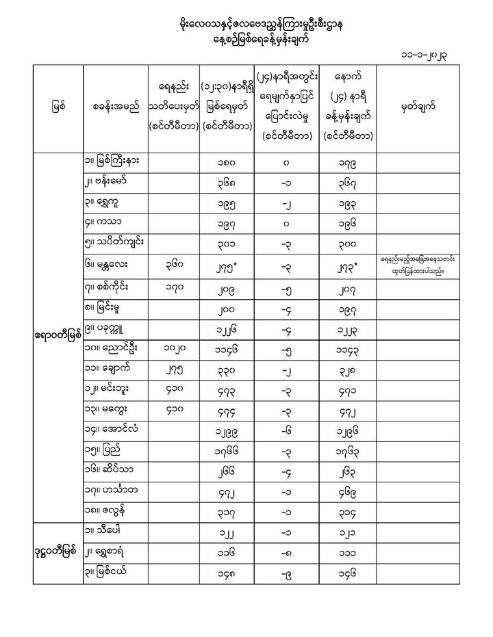 မိုးလေဝသနှင့်ဇလဗေဒညွှန်ကြားမှုဦးစီးဌာနမှ (၁၁.၁.၂၀၂၃) ရက်နေ့တွင် ထုတ်ပြန်သည့် နေ့စဉ်မြစ်ရေခန့်မှန်းချက်များ