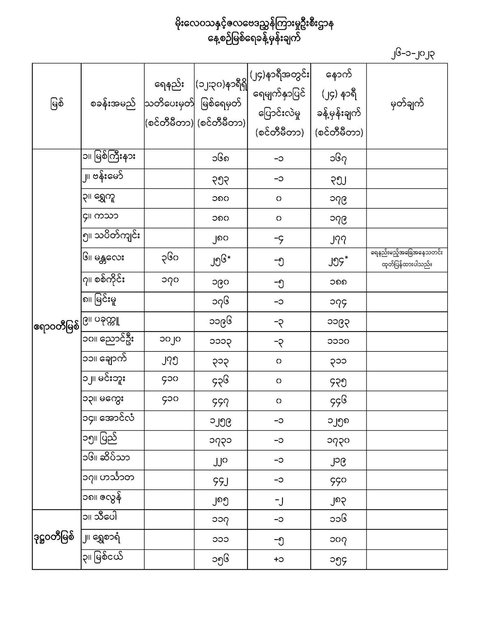 မိုးလေဝသနှင့်ဇလဗေဒညွှန်ကြားမှုဦးစီးဌာနမှ (၂၆.၁.၂၀၂၃) ရက်နေ့တွင် ထုတ်ပြန်သည့် နေ့စဉ်မြစ်ရေခန့်မှန်းချက်များ